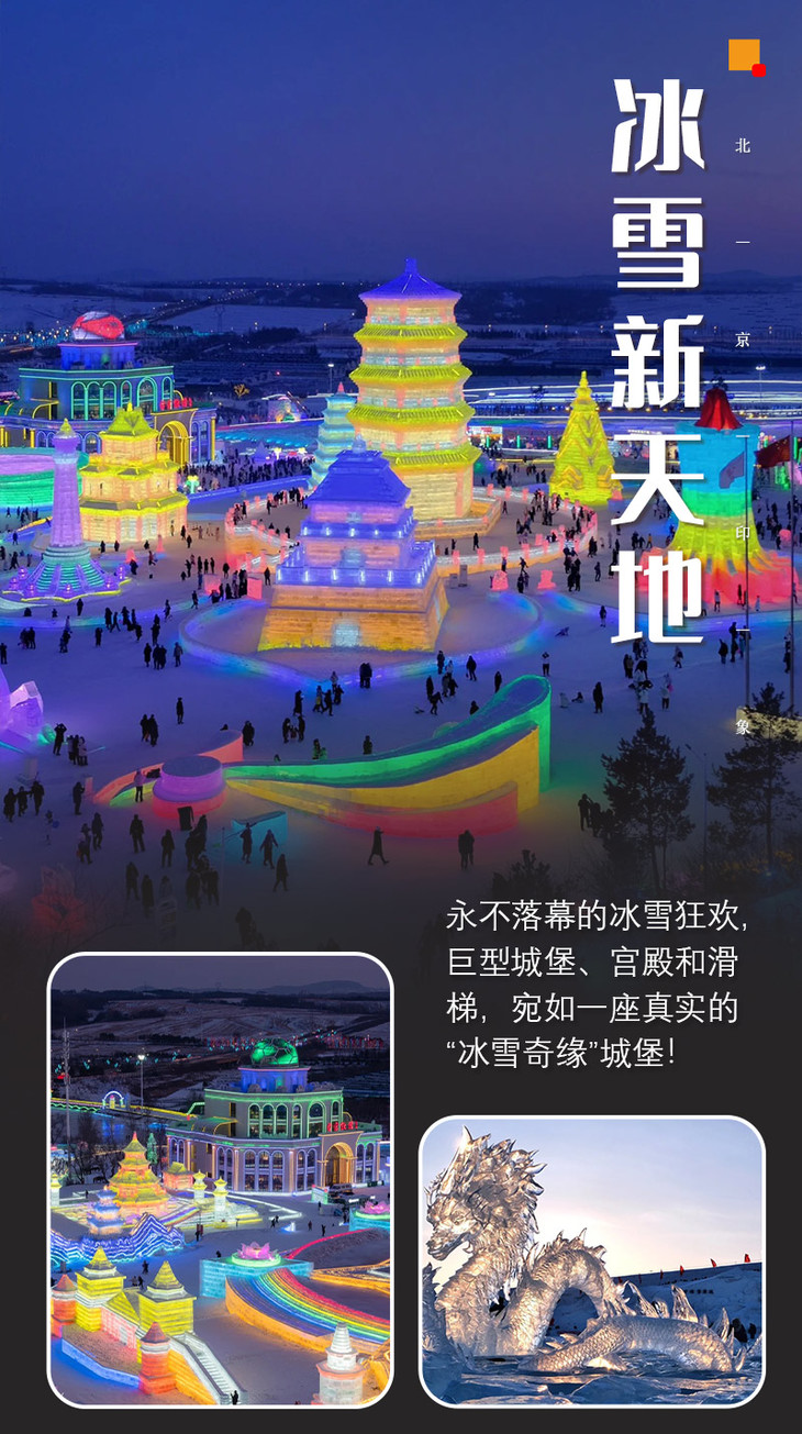 - 下午适时前往长春的酒店安排入住。之后集合前往哈尔滨冰雪大世界平替长春【冰雪新天地】。