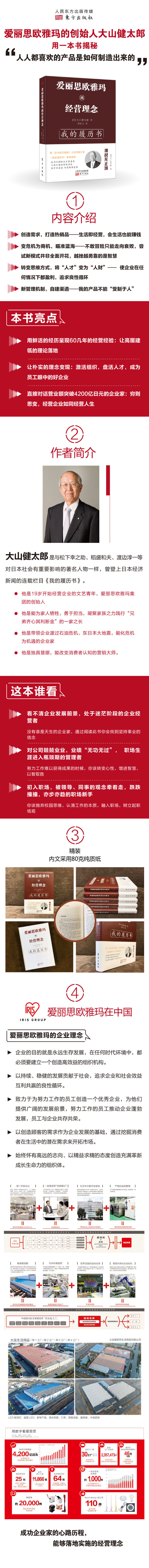 大山健太郎,1945年生于大阪,爱丽思集团会长。1990年,在社团法人新商业协会主办的“第一届新商业协会颁奖典礼”获得最优秀奖;1997年成立大连爱丽思欧雅玛工贸有限公司,之后获得中国“大连市荣誉市民”称号;2009年,获得蓝缎荣誉勋章和“仙台市市政特别贡献者奖”;2017年,获得日本政府颁授的象征企业界至高荣誉的“旭日重光章”。著有《制造供应商的市场战略》《家居解决方案管理》《危机即机遇》《长销产品会害了企业》等作品。2016年3月,日本经济新闻《我的履历书》栏目连载大山健太郎的《爱丽思欧雅玛的经营理念》。