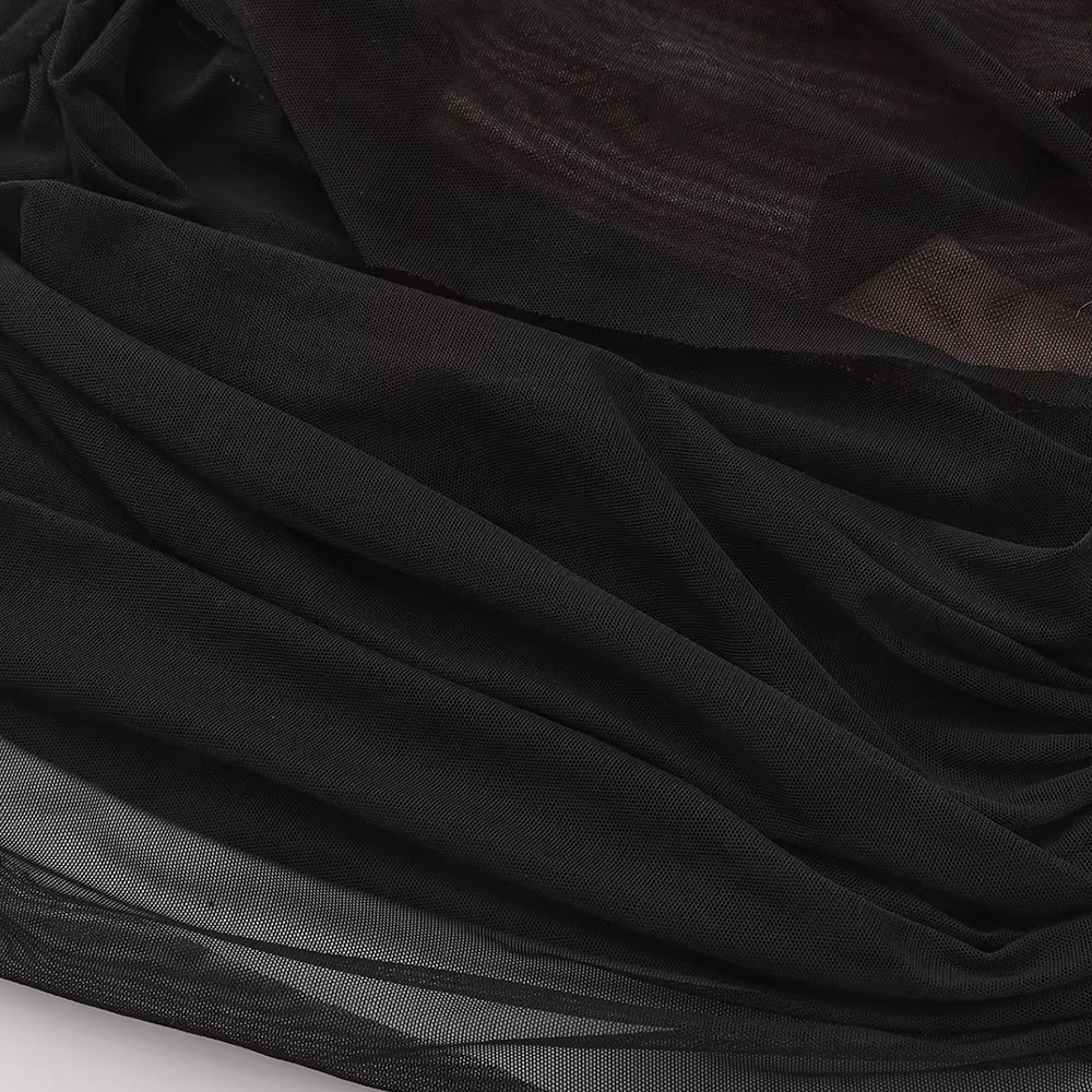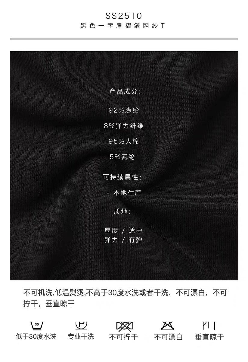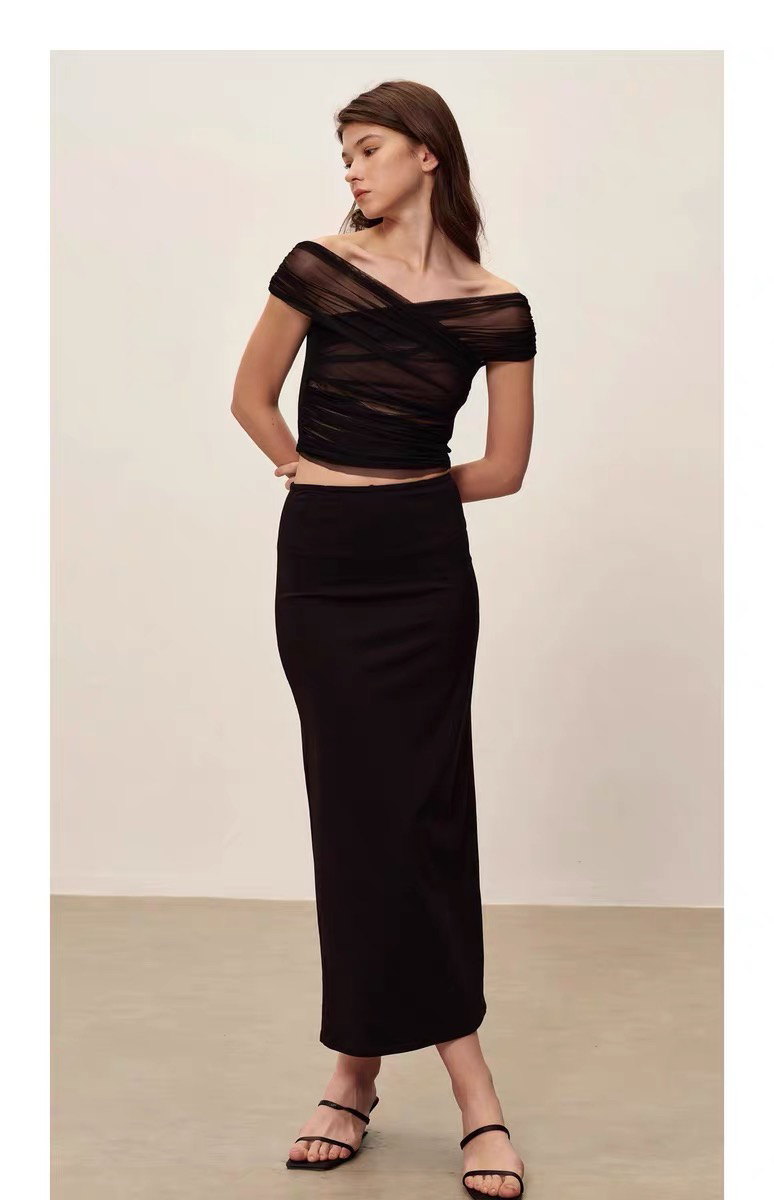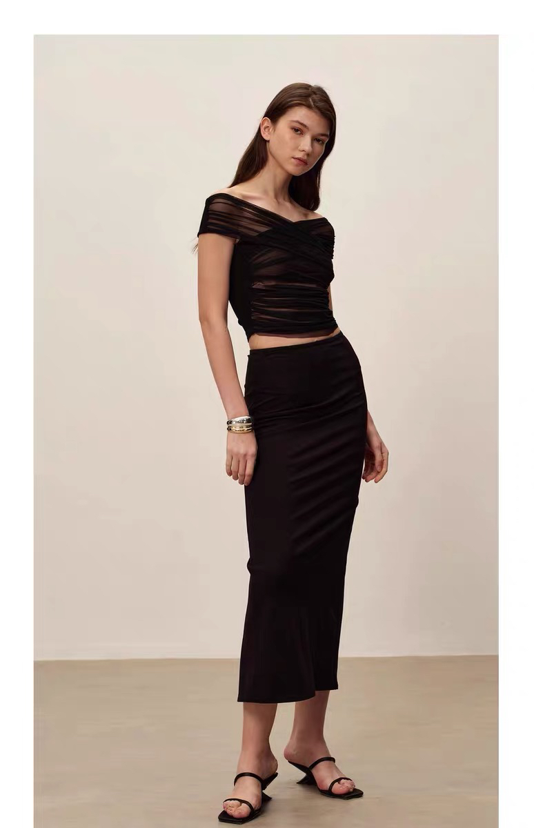 SIJIA|黑色一字肩褶皱网纱T [ 黑SS2510 ]