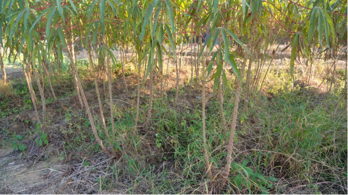 木薯是很粗生的作物,春天时起垄,把茎分成一段一段种下去,就不用打理了。木薯茎秆比较高,可以长到2米多,因此也不用除草、下肥,非常容易生长。在村里,唯一要担心的就是秋冬时候的野猪。