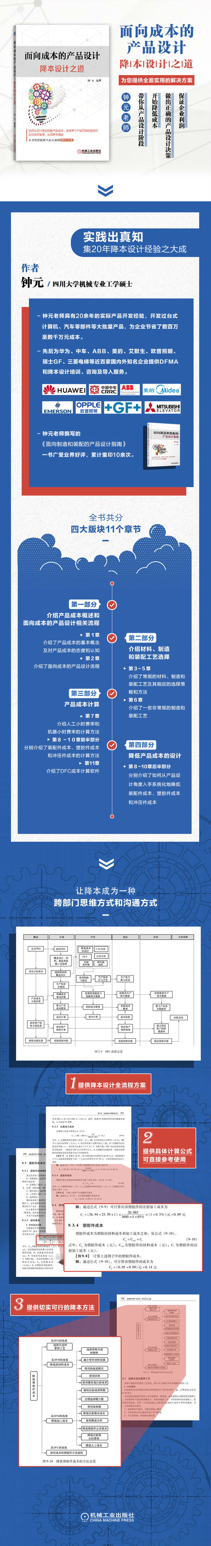 第四部分是降低产品成本的设计。在第8~10章后半部分分别介绍如何从产品设计角度入手系统化地降低装配件成本、塑胶件成本和冲压件成本,在产品成本实际发生之前就对产品成本进行管控。