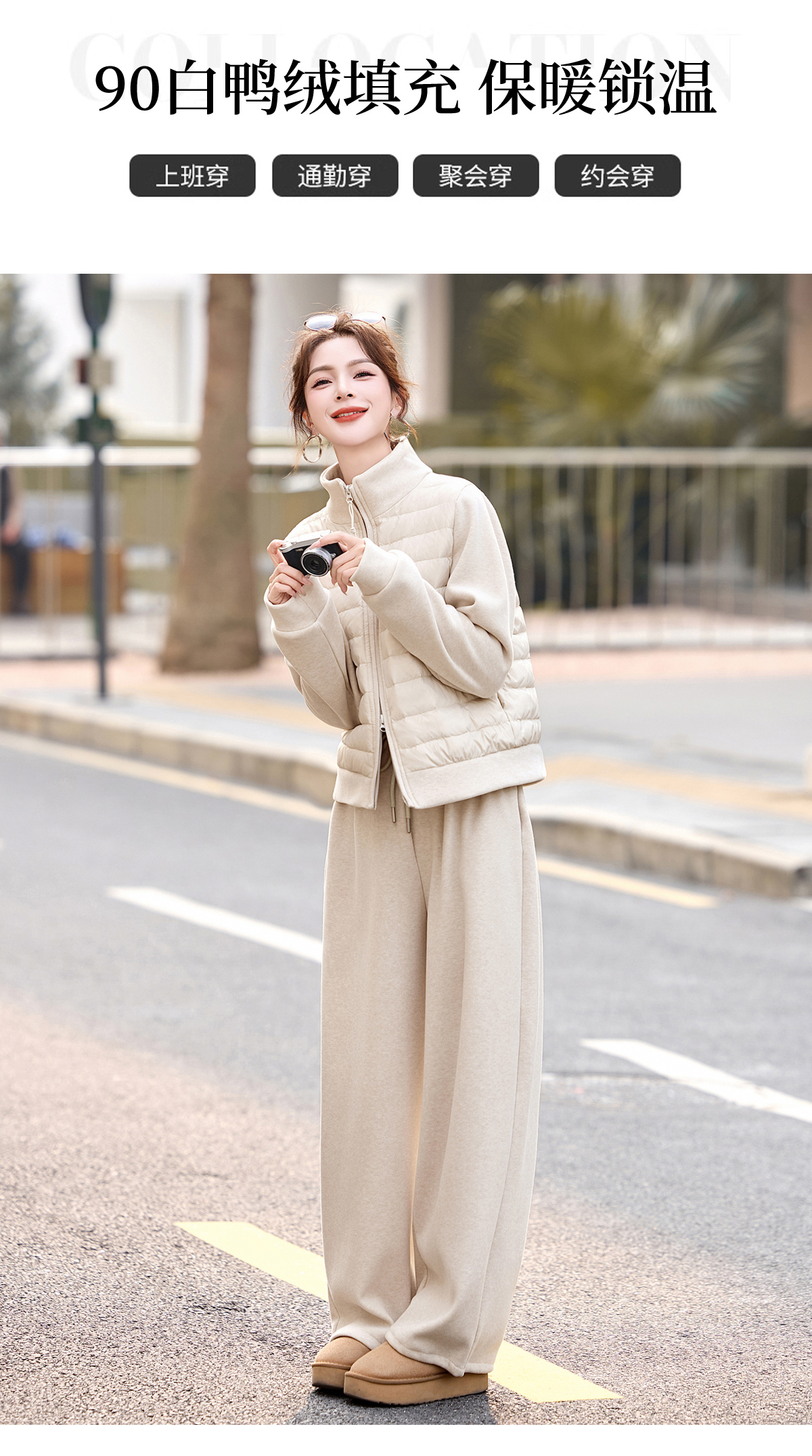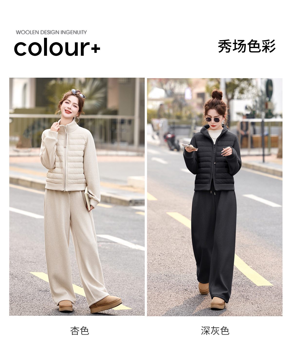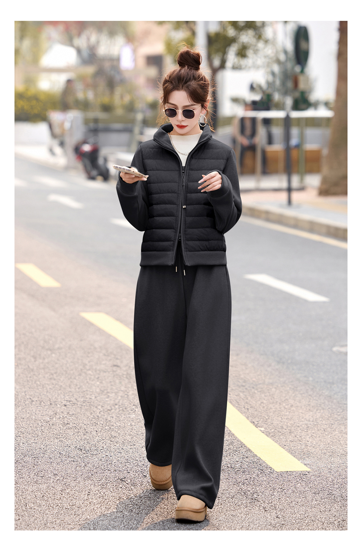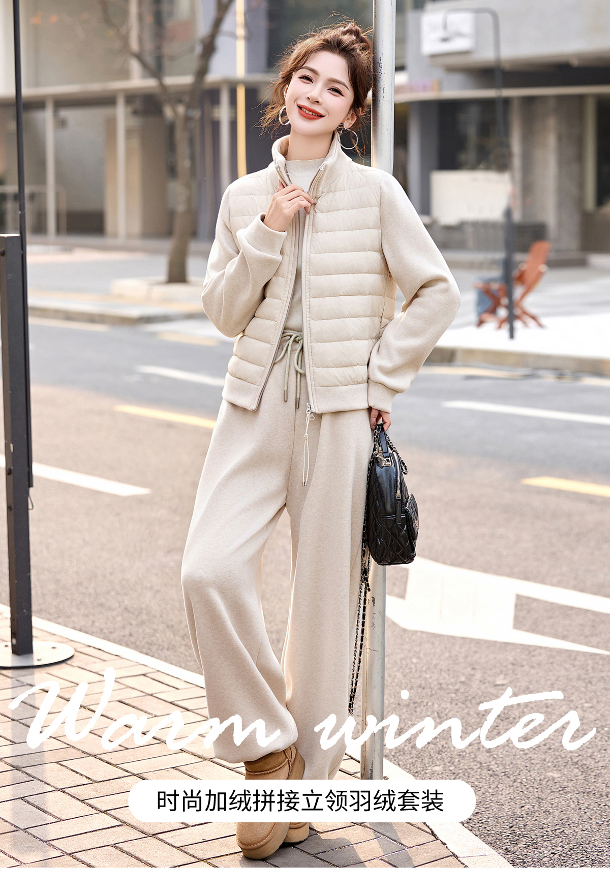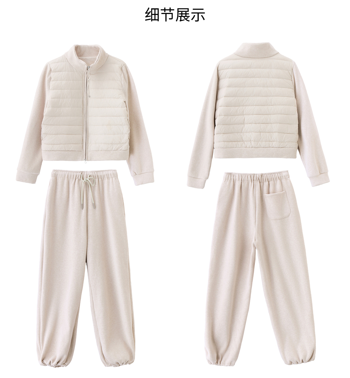 韩版拼接立领排骨90绒羽绒服外套,配加厚松紧腰卫裤套装HR-YDYX9511