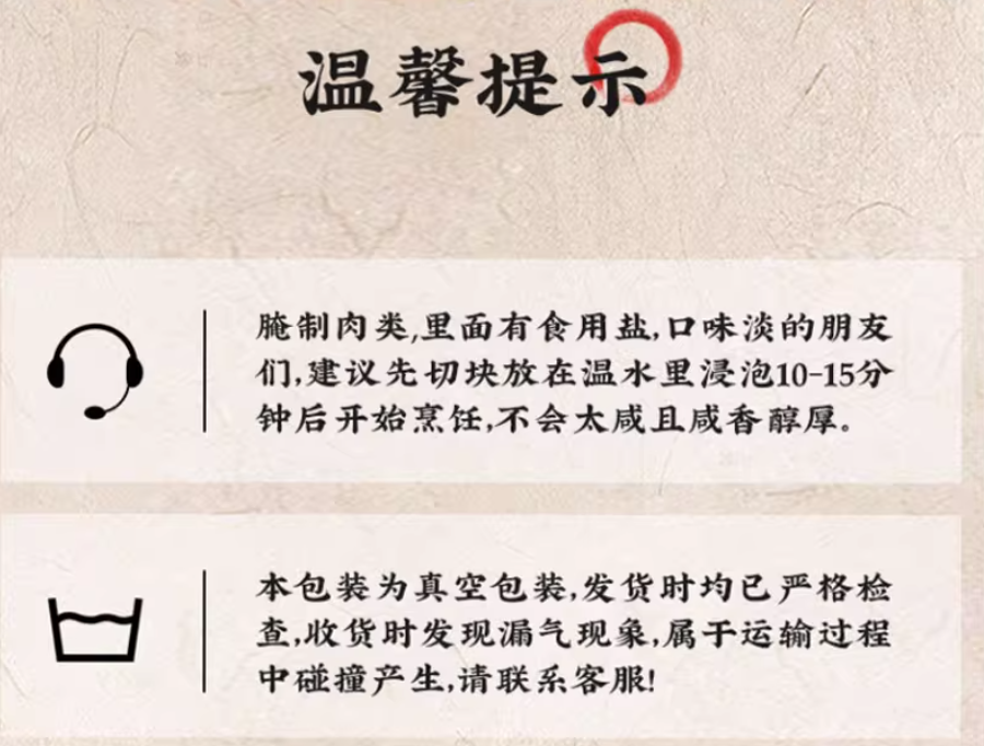 【品名】九华山 腊味套餐礼盒 【规格】 A套餐(五花酱肉500g |风干鸭550g|手工咸香肠500g|纯农家手工粉丝500g|笋干100g) B套餐(五花酱肉500g |风干鸭550g|非遗手工麻油100ML*2瓶|纯农家手工粉丝500g|笋干100g) C套餐(刀板香500g |五花酱肉500g |风干鸡700g|风干鸭550g|火腿芯300g|草鱼段400g|手工酱香肠500g|手工咸香肠500g)【储存方法】请置于阴凉干燥处,避免阳光直射 【产地】安徽池州 【发货地】安徽池州 【发货快递】顺丰 【不发货区域】新疆,西藏,青海,内蒙古,甘肃,黑龙江,吉林 ,港澳台地区不发 【发货时效】48小时,节假日顺延 |