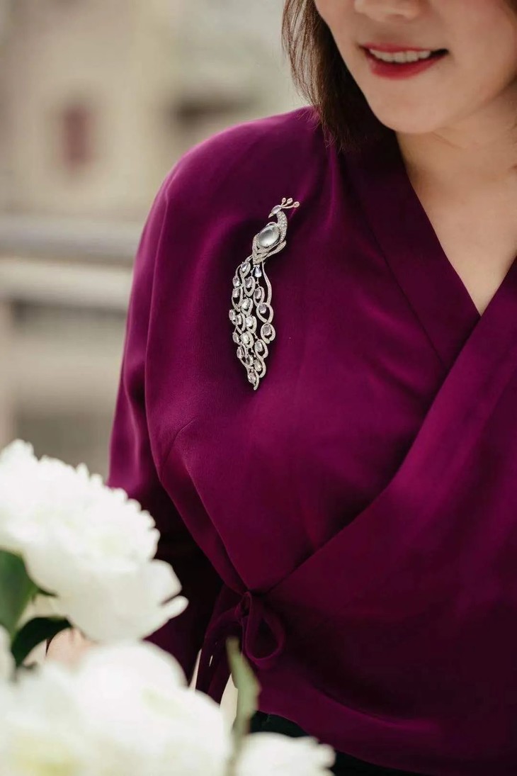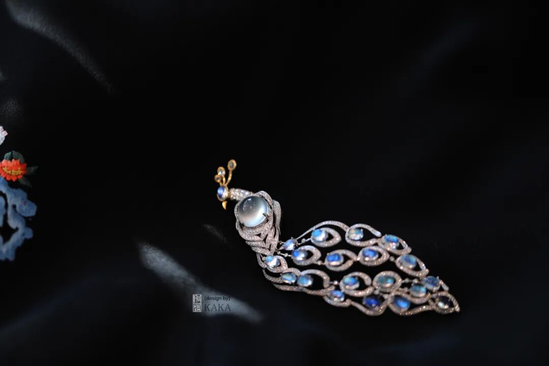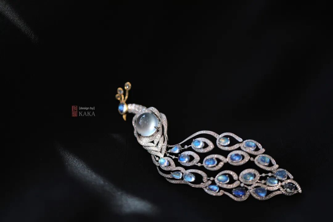孔雀的头脸部也用了单颗月光石,它的蓝晕的光恰好有猫眼般的效果,让孔雀的眼神呈现出一种高傲而睥睨天下的气质,很符合这个世界上最美的大雀的神色。