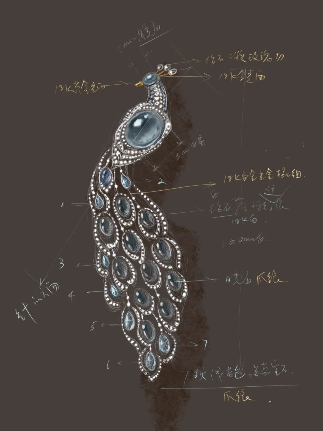 我在孔雀的身体和尾巴之间,设计了一个可晃动的环节,于是整体孔雀在佩戴时候是可以有弧度的,