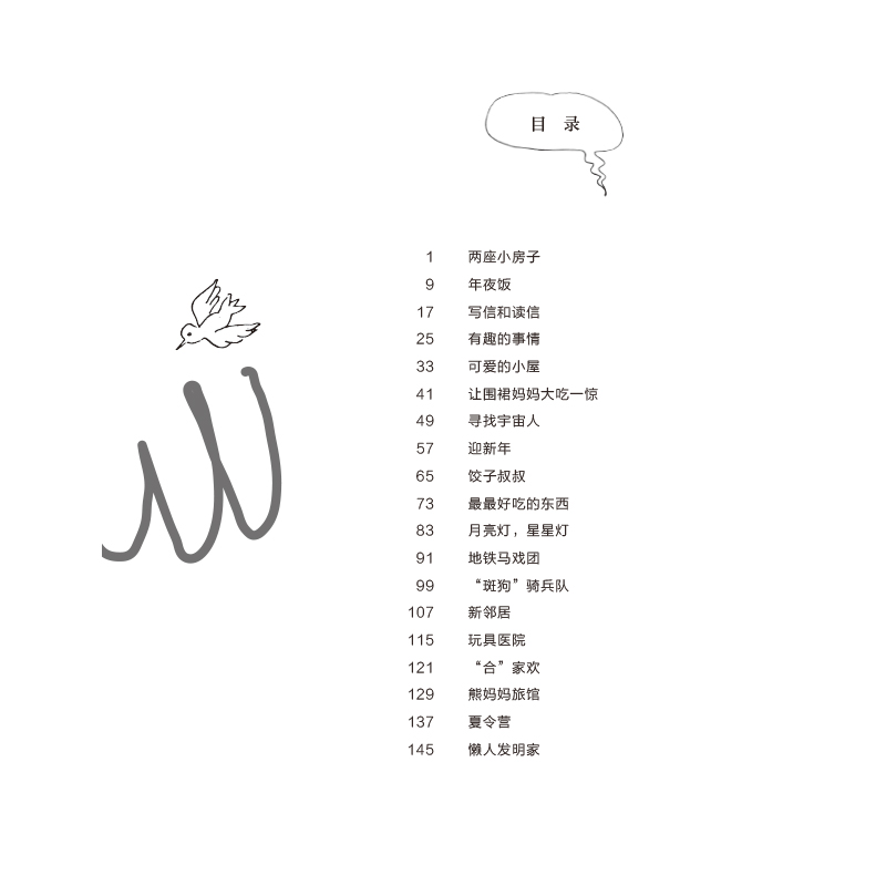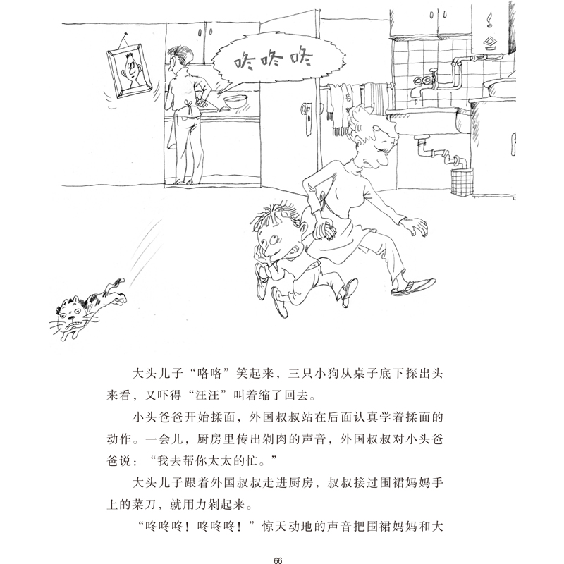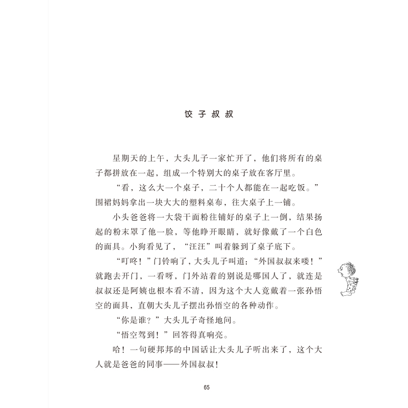 作家从儿童的视角出发,将一系列妙趣横生的故事,与儿童的日常生活与丰富的想象串联在一起,通过大头儿子、小头爸爸、围裙妈妈充满乐趣的日常生活映射出大人与儿童共同的成长与快乐:临近过年,要和野猫和麻雀斗智斗勇,守护年货;在父子不能见面的时候,学着用质朴的书信表达想念;和外国叔叔一起创造掺了惊喜馅料的饺子;在停电的夜里享受亲子相处的温馨时光,用故事、游戏和亲情填补黑漆漆的晚上;给孤儿院的小女孩送名字,还帮她找到了爱她的爸爸妈妈……