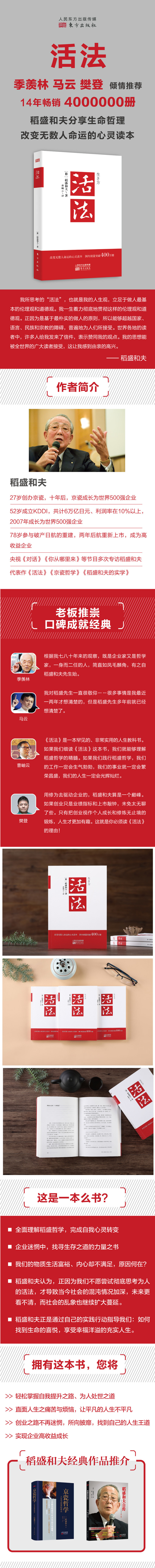 做企业的目的是什么?赢利!做企业人的目标是什么?帮企业赢利!然而,为什么在财务报表形势喜人、经营业绩节节攀升的同时,我们还会听到公司员工对老板的私下抱怨,看到高层们面对发展的十字路口无法舒展的愁眉,甚至此时正目睹着各界舆论对业界翘楚、时代精英们毫不留情、铺天盖地的指责与奚落?诚然,所有企业及企业人都恪守着赢利――这一亘古不变的原则在时代的浪潮中奋勇前进,但是又有多少人真正参透了利益背后的玄机?中国并不需要“道义放两边、利字摆中间”的商业大鳄,更不会提供给缺乏德行、忽视修为的企业人广阔发展的康庄大道;如果想在白热化的竞争中一枝独秀,就必须要剖开经济的表象,探求企业的本质,找到得以在如今的世道中生存下去的活法。这本《活法》的作者稻盛和夫是日本战后经济的传奇,他不用优美的文字取胜,也不用高深的说教让人五体投地,而是将其多年心得以质朴的文字向我们娓娓道来。企业人会从中领会真正的企业发展之路,而普通人亦将感受到*境界的“为人之道”。