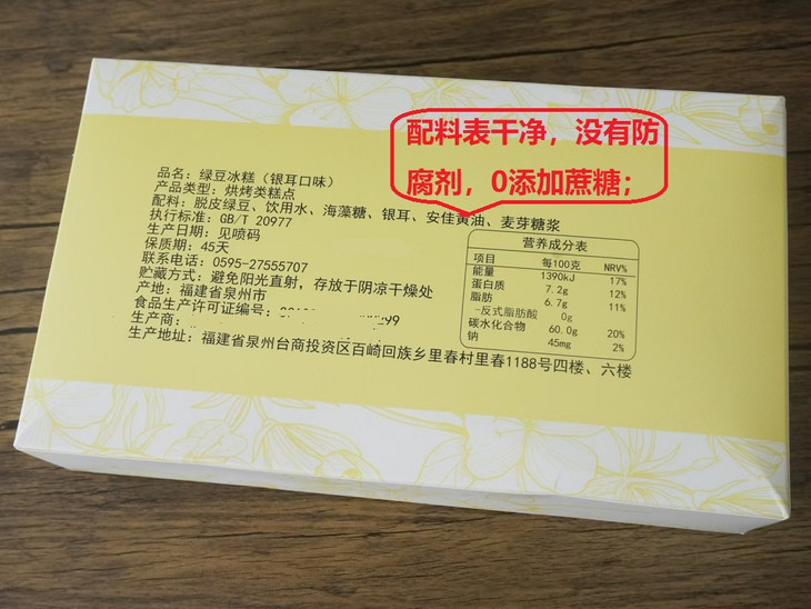 品名:绿豆银耳冰糕 规格:绿豆银耳冰糕200g/盒*2盒;拍几份发几个包裹,不一定能同时到达,请耐心等待; 发货地/产地:福建 包装方式:盒装+独产小包装 保质期:45天 物流信息:默认中通快递,不支持指定快递 发货区域:新疆、西藏、内蒙、青海、宁夏、甘肃不发;北京、上海+1元; 物流详情:周六、周日及节假日除外,正常12小时内发货,到货时间约为2~5天,请耐心等待 售后说明:收到货后有质量问题,在24小时内都可以拍照(坏品+快递单面箱子一起拍)上传,申请按坏品比例理赔或联系客服,生鲜食品性质特殊,不支持7天无理由退换货;因地址错误,手机号联系不上,未及时签收,拒收等造成的损失无法售后,请理解; |