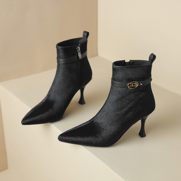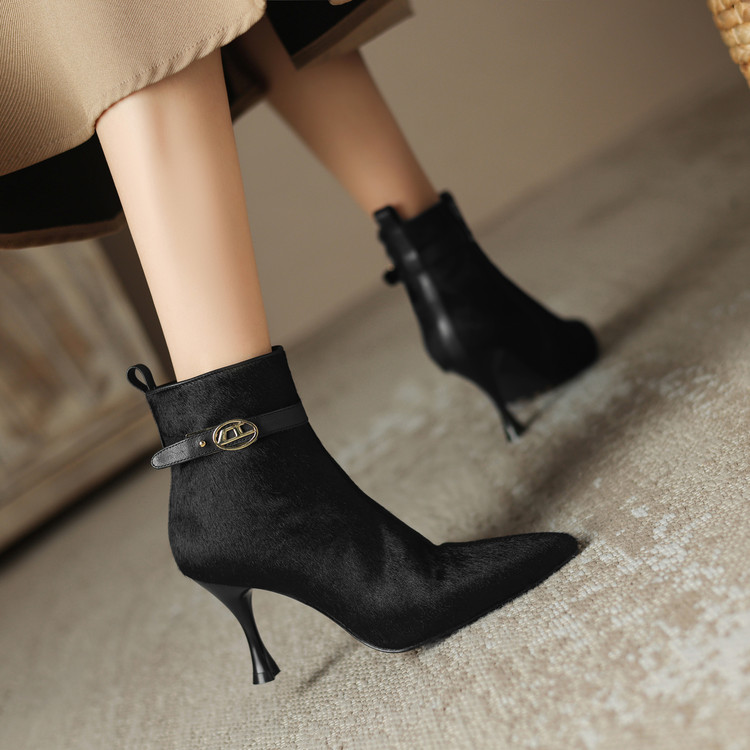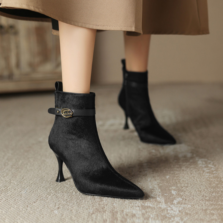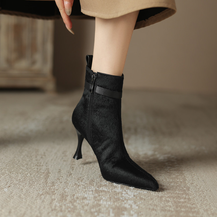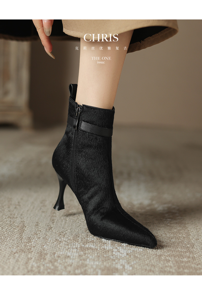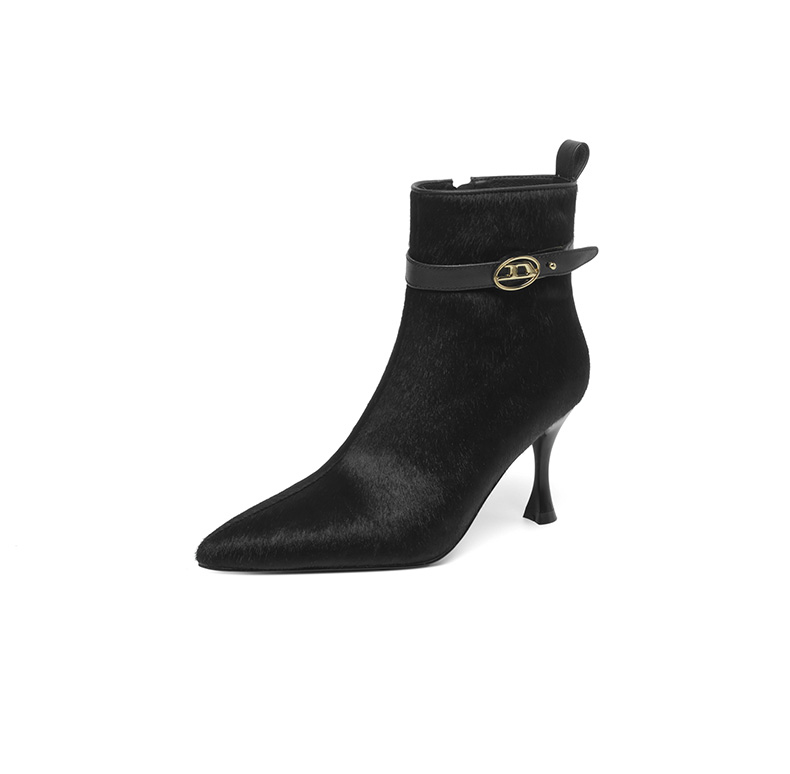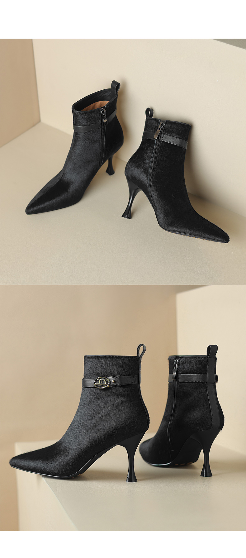 【预售5天】新款尖头细跟高跟短靴女时尚马毛百搭舒适瘦瘦靴侧拉链时装靴HP&A2565-1