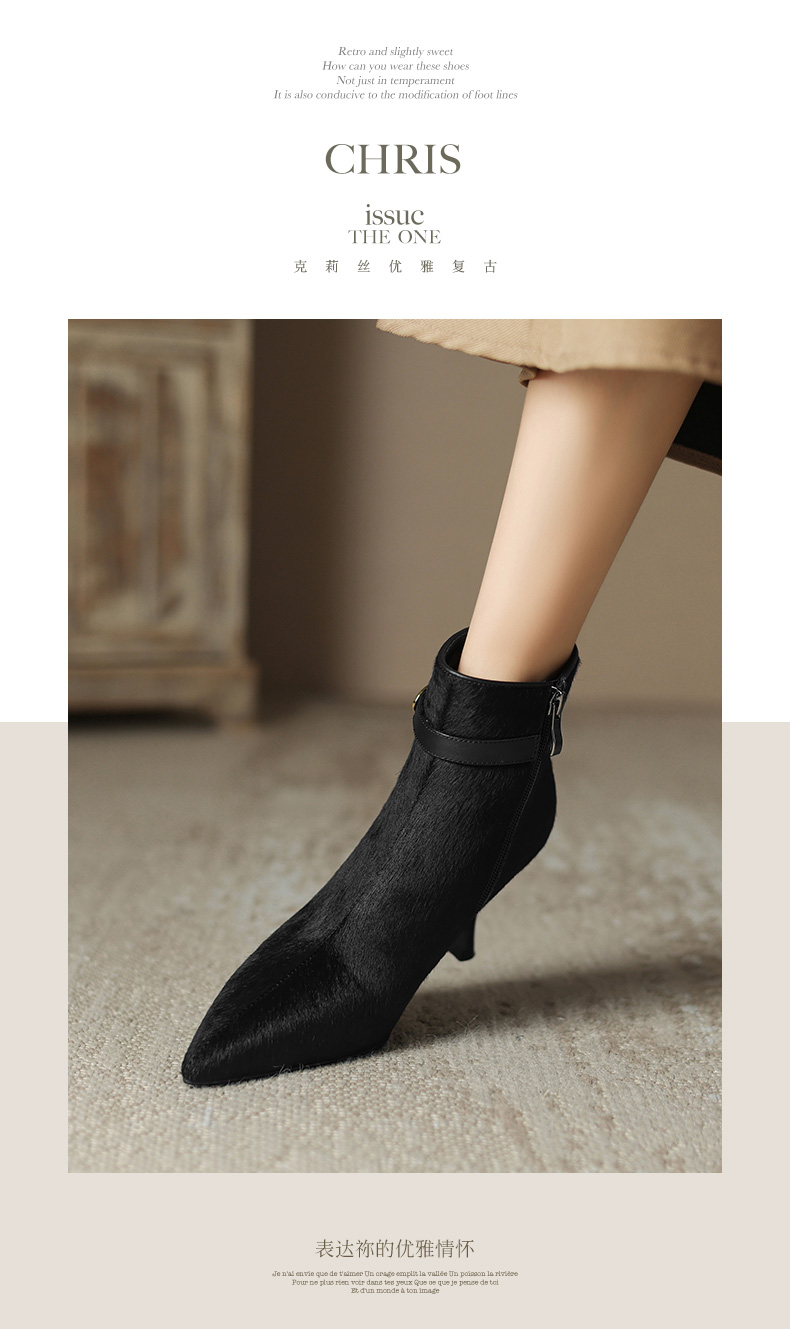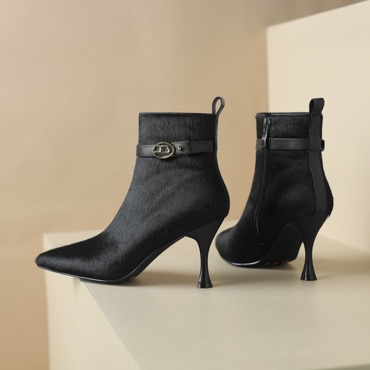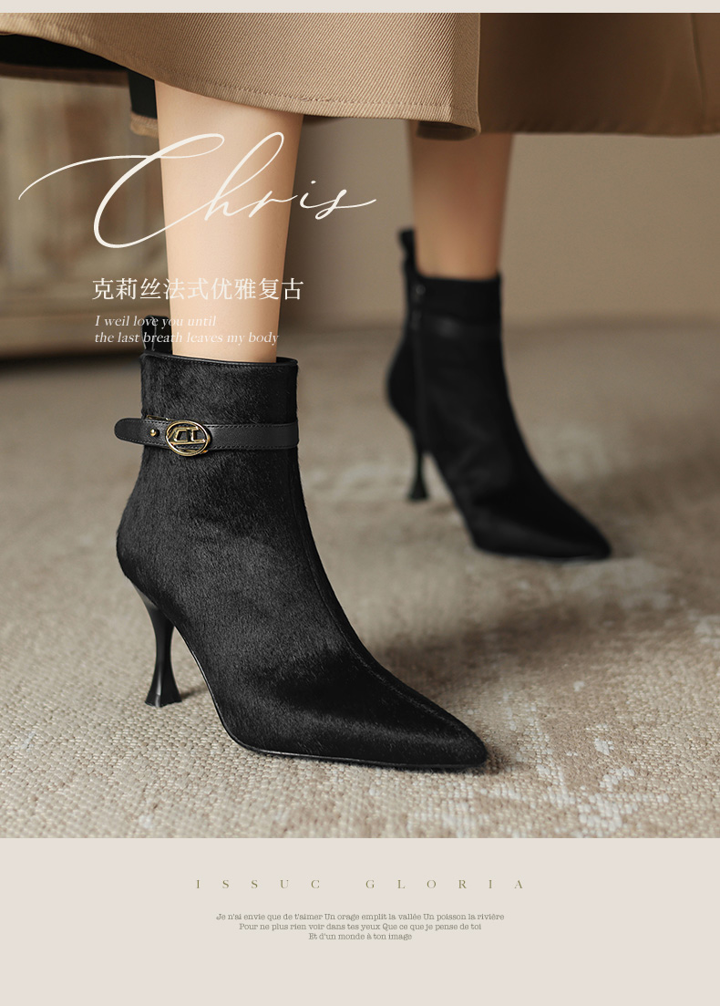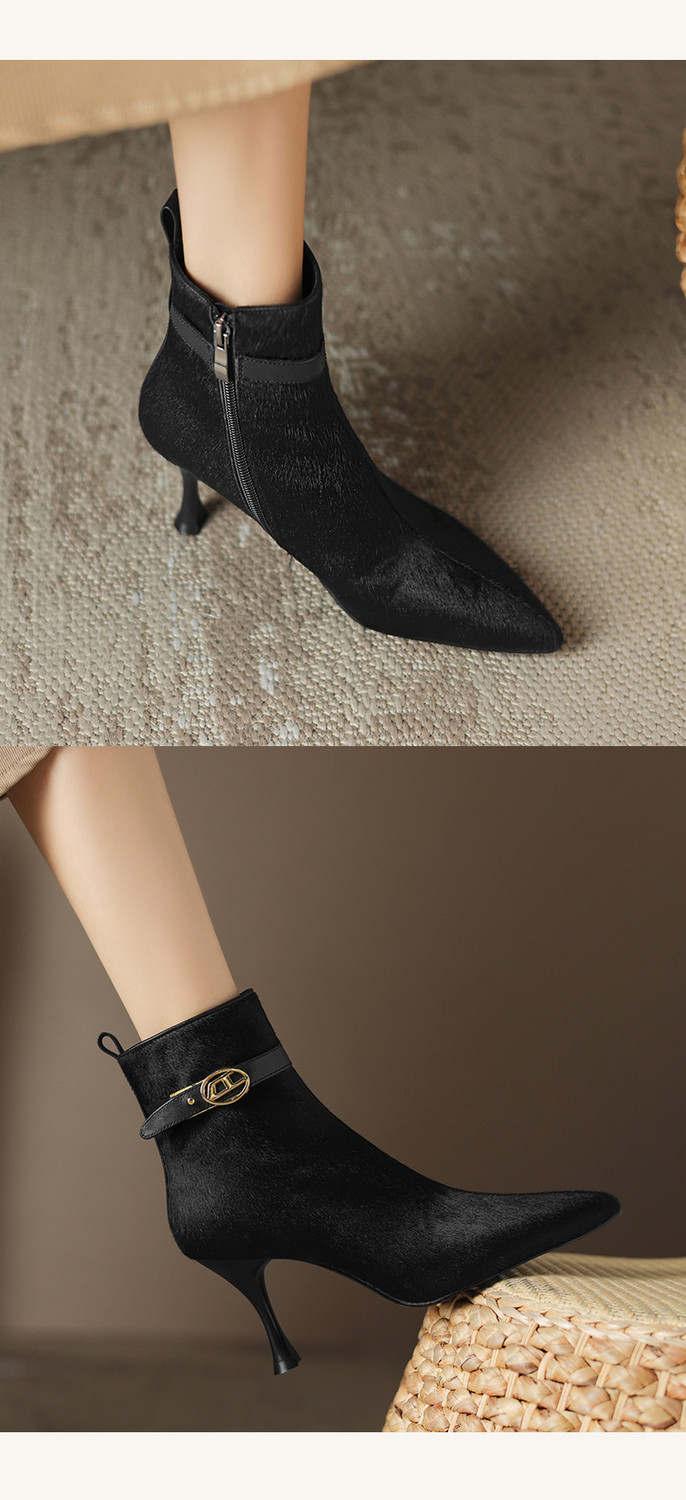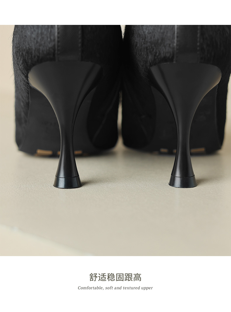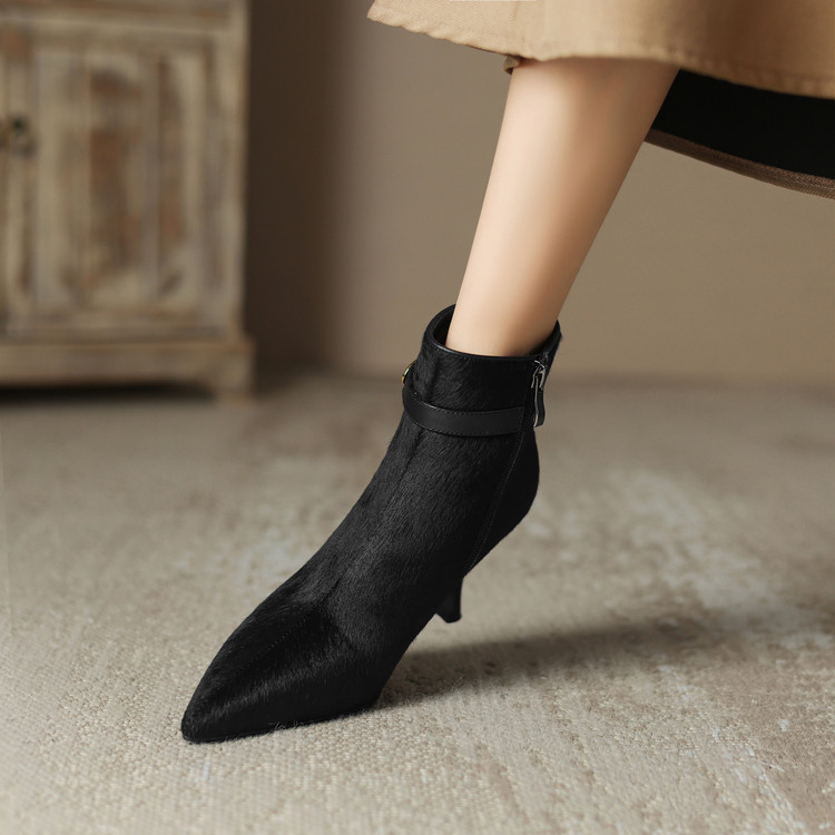 【预售5天】新款尖头细跟高跟短靴女时尚马毛百搭舒适瘦瘦靴侧拉链时装靴HP&A2565-1