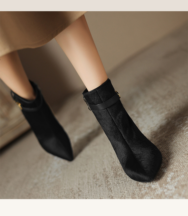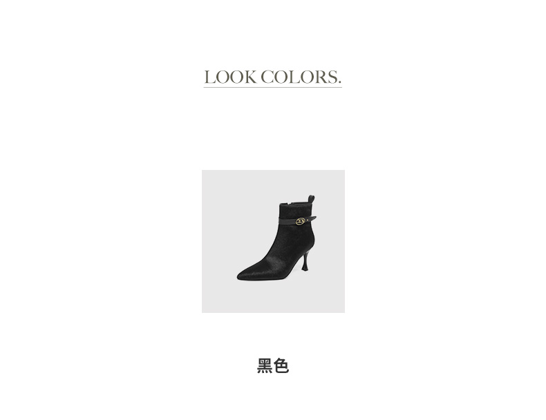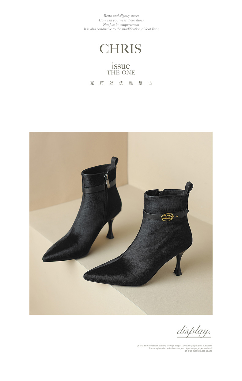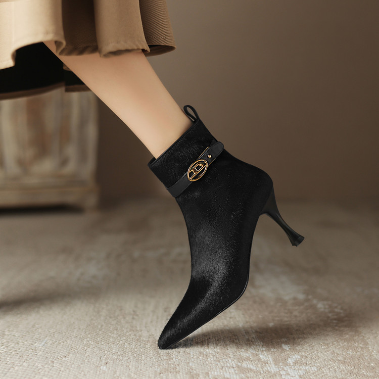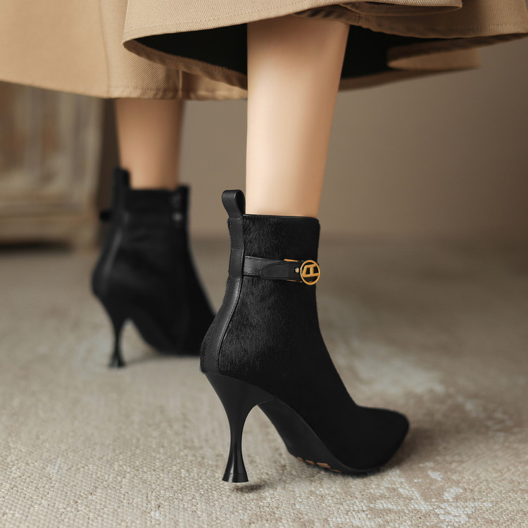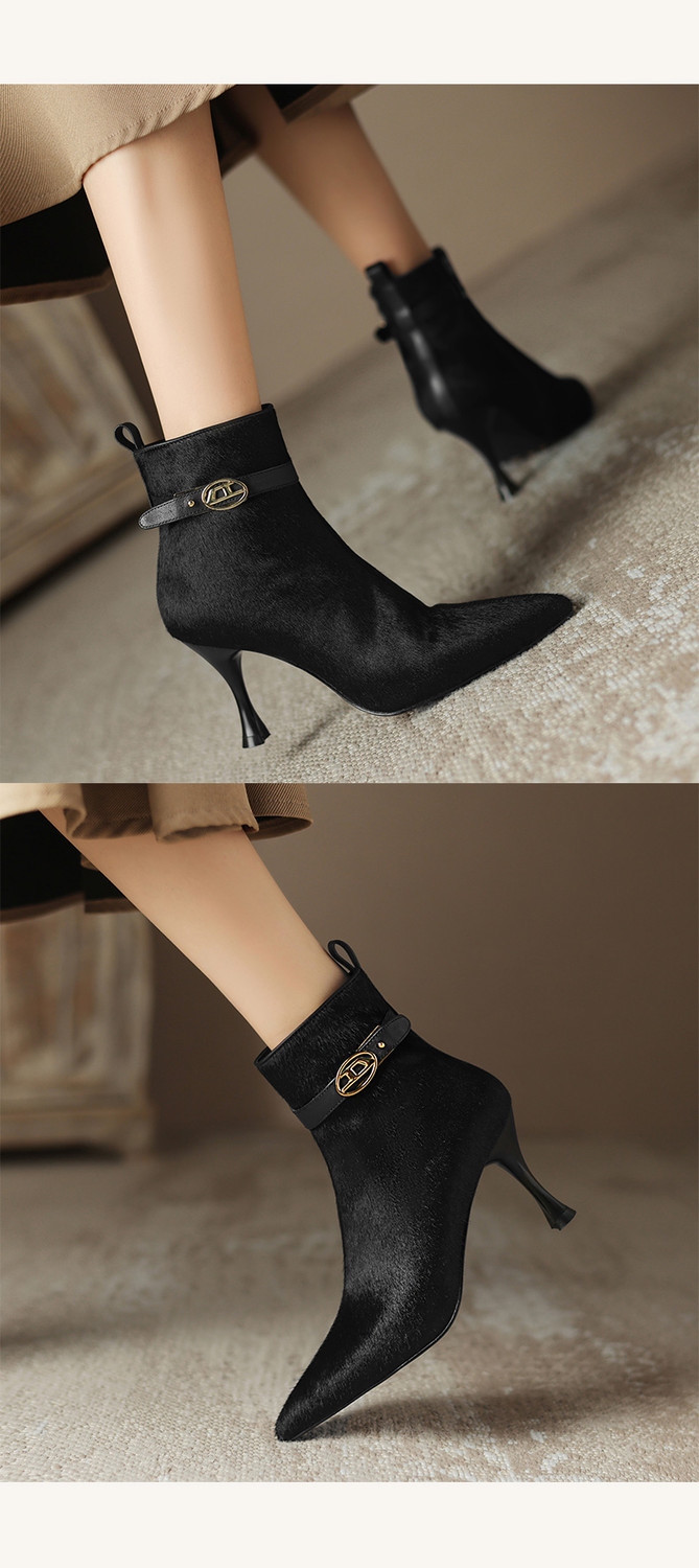 【预售5天】新款尖头细跟高跟短靴女时尚马毛百搭舒适瘦瘦靴侧拉链时装靴HP&A2565-1