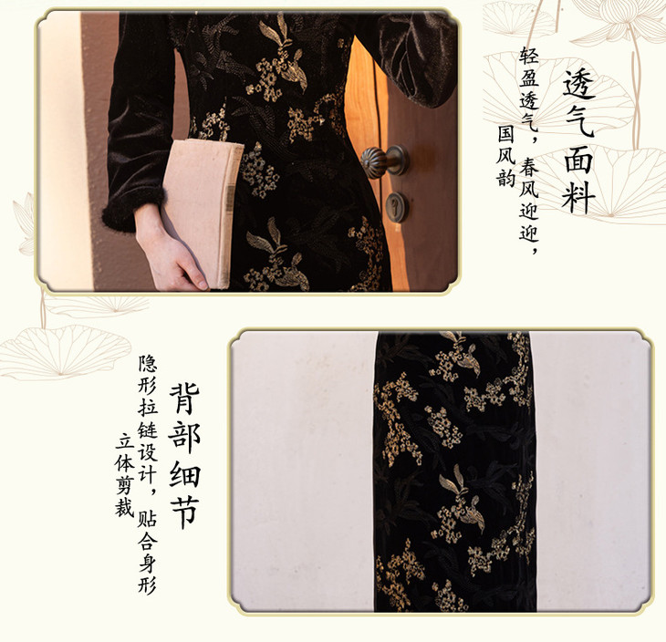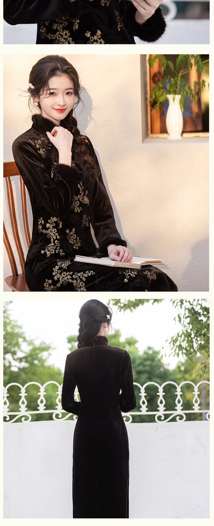 冬款韩国绒刺绣长款旗袍,加绒加厚黑色高级气质旗袍SJT710