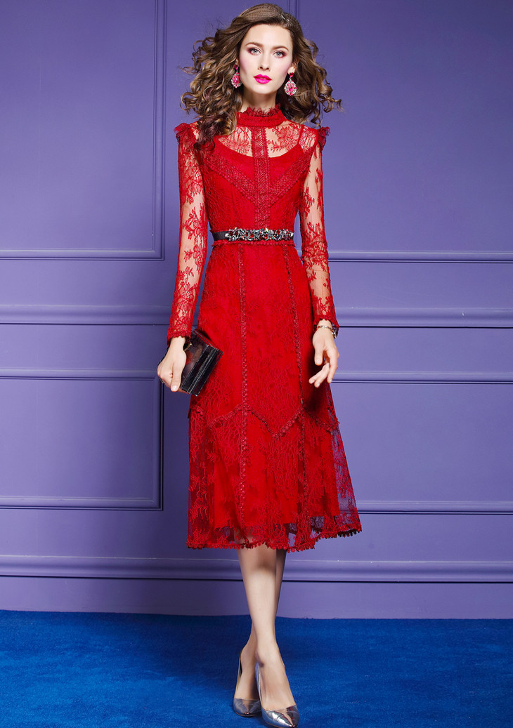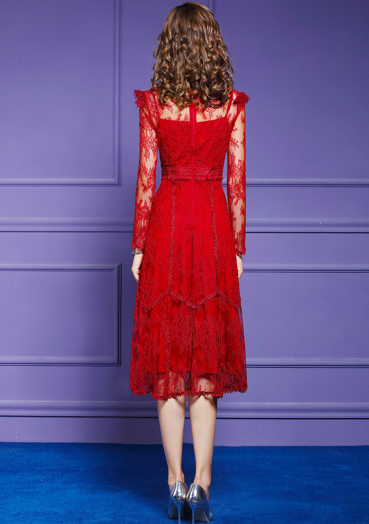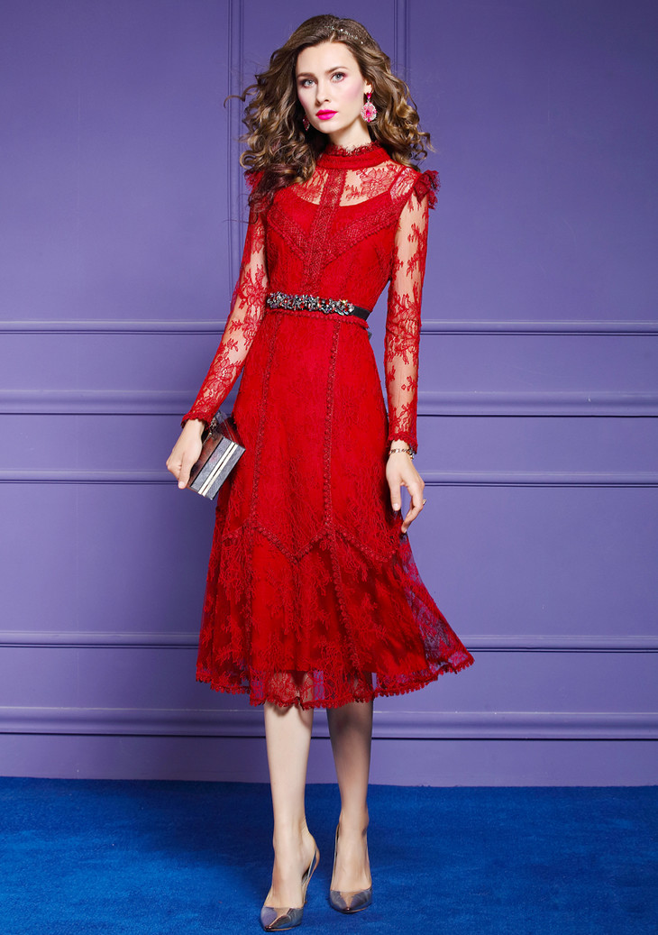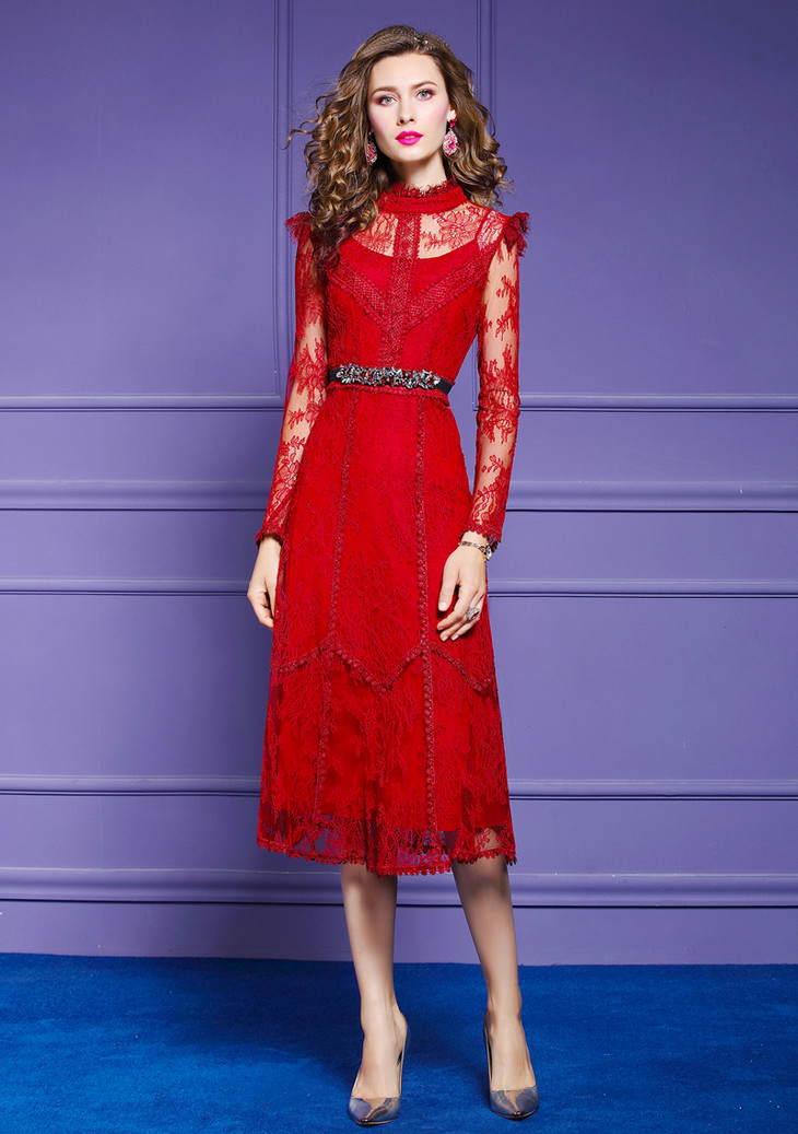 FMY-F20CL30378夏新款轻熟气质显瘦修身超仙过膝蕾丝连衣裙