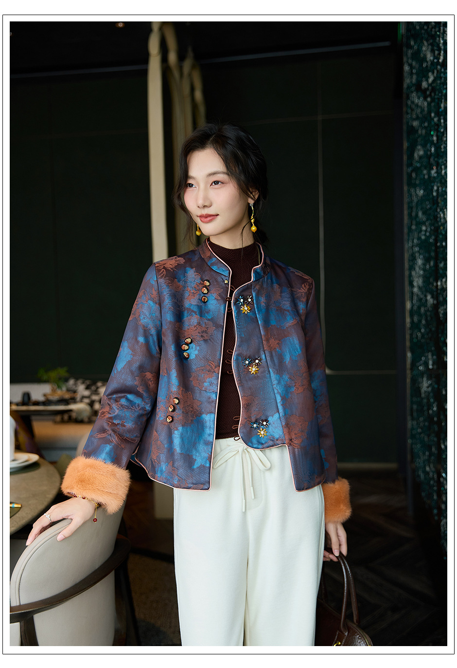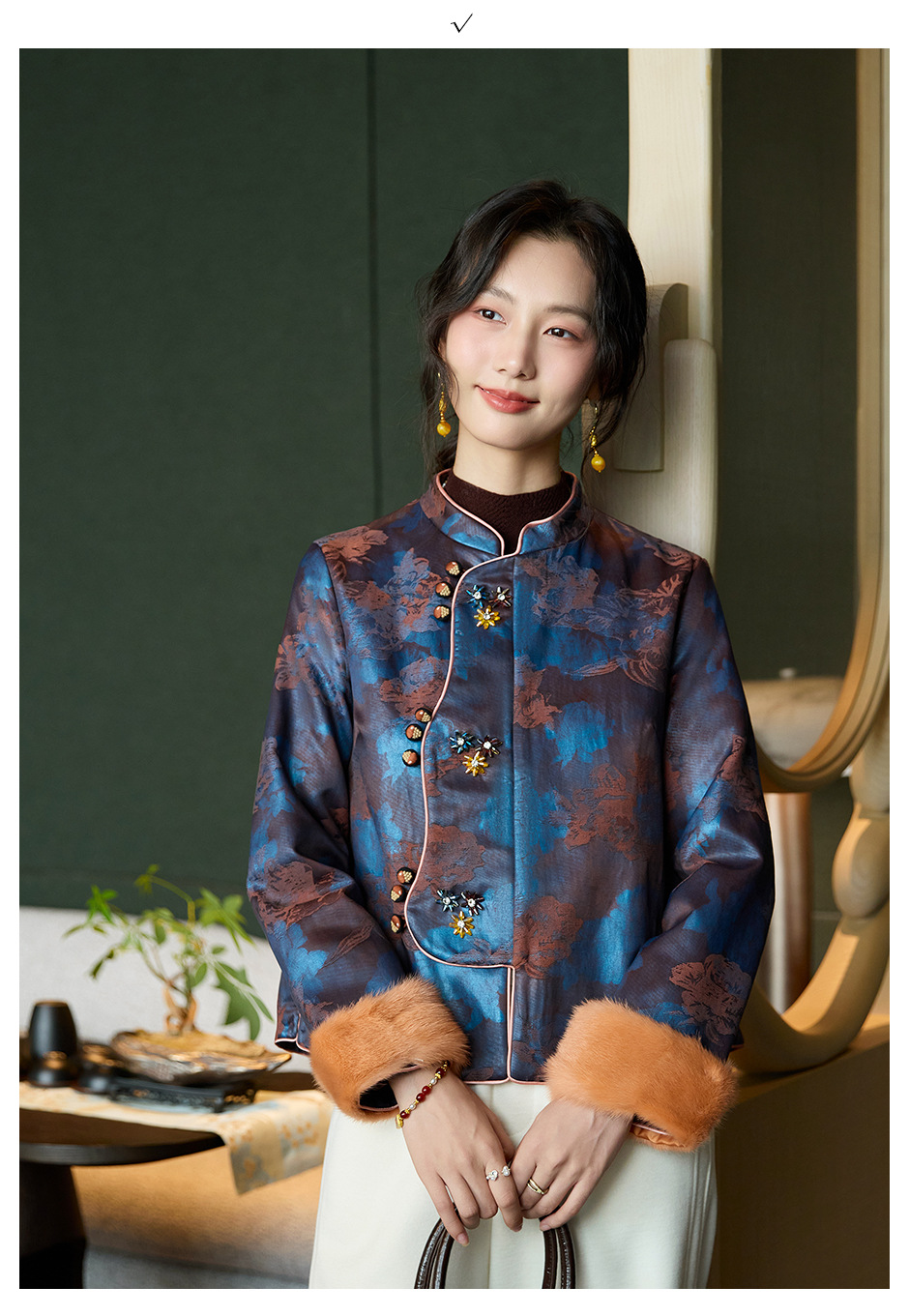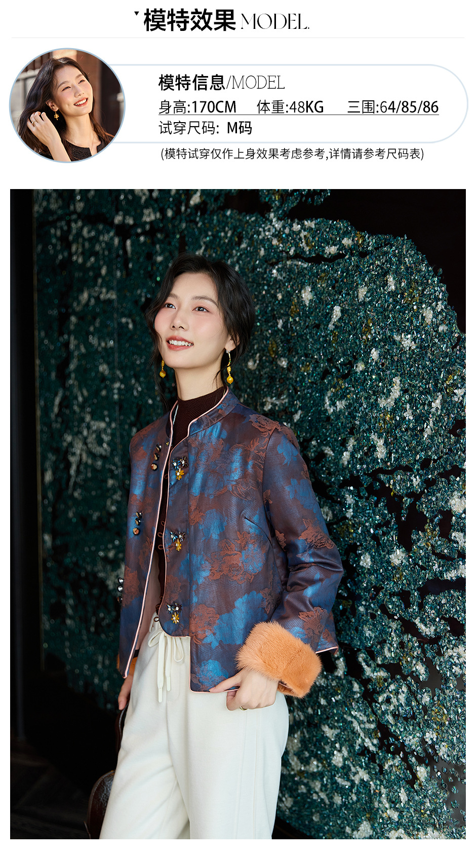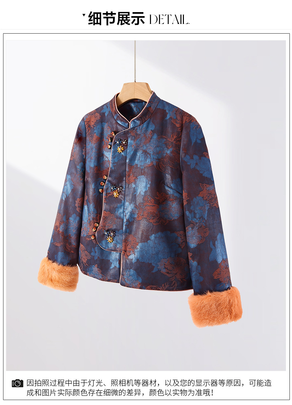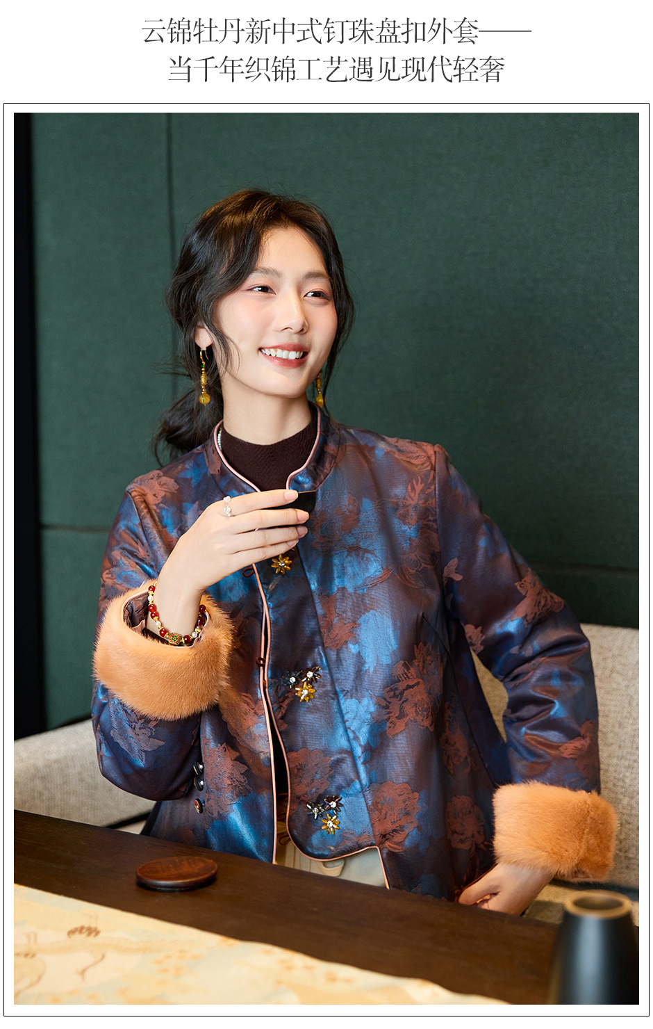 丁摩 水貂毛钉珠宋锦女秋冬新中式盘扣加厚保暖短款羊毛外套上衣5ZF-76051