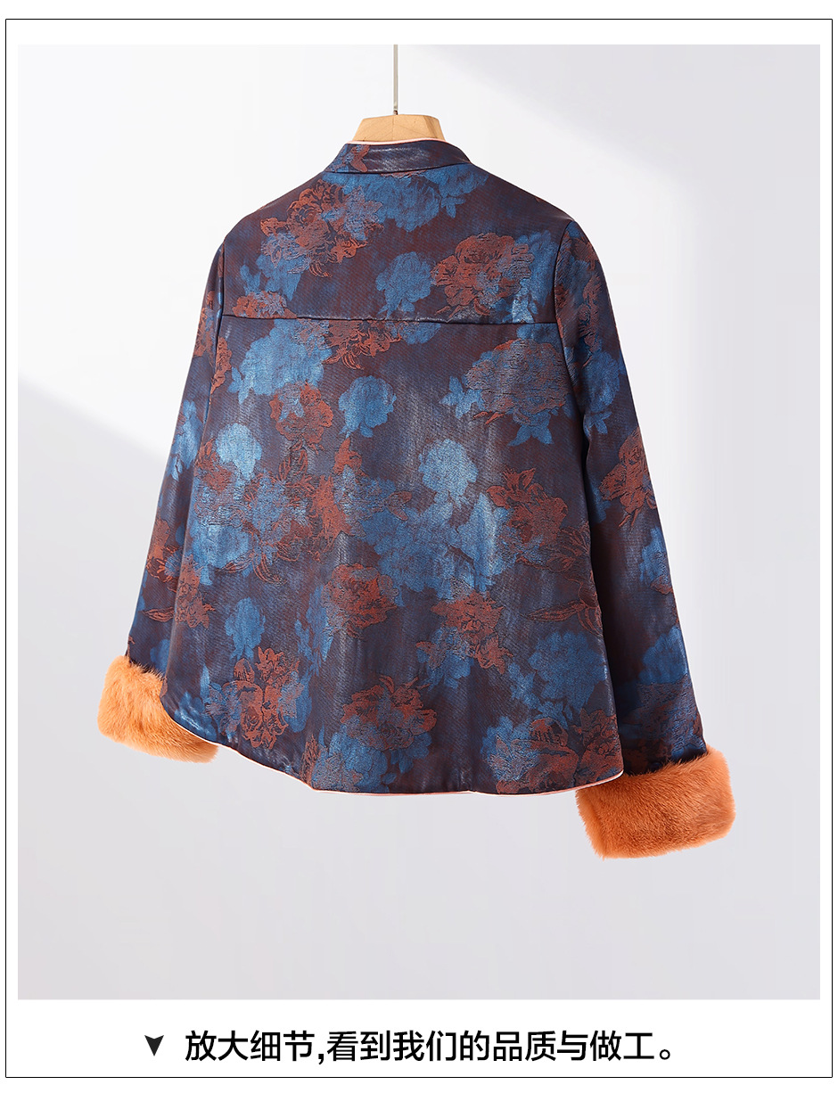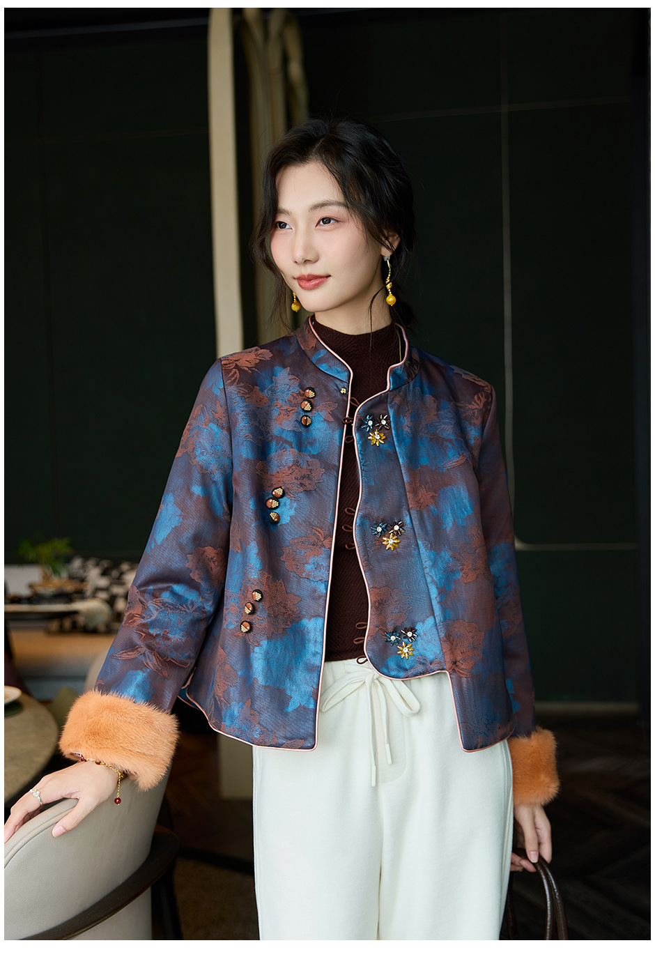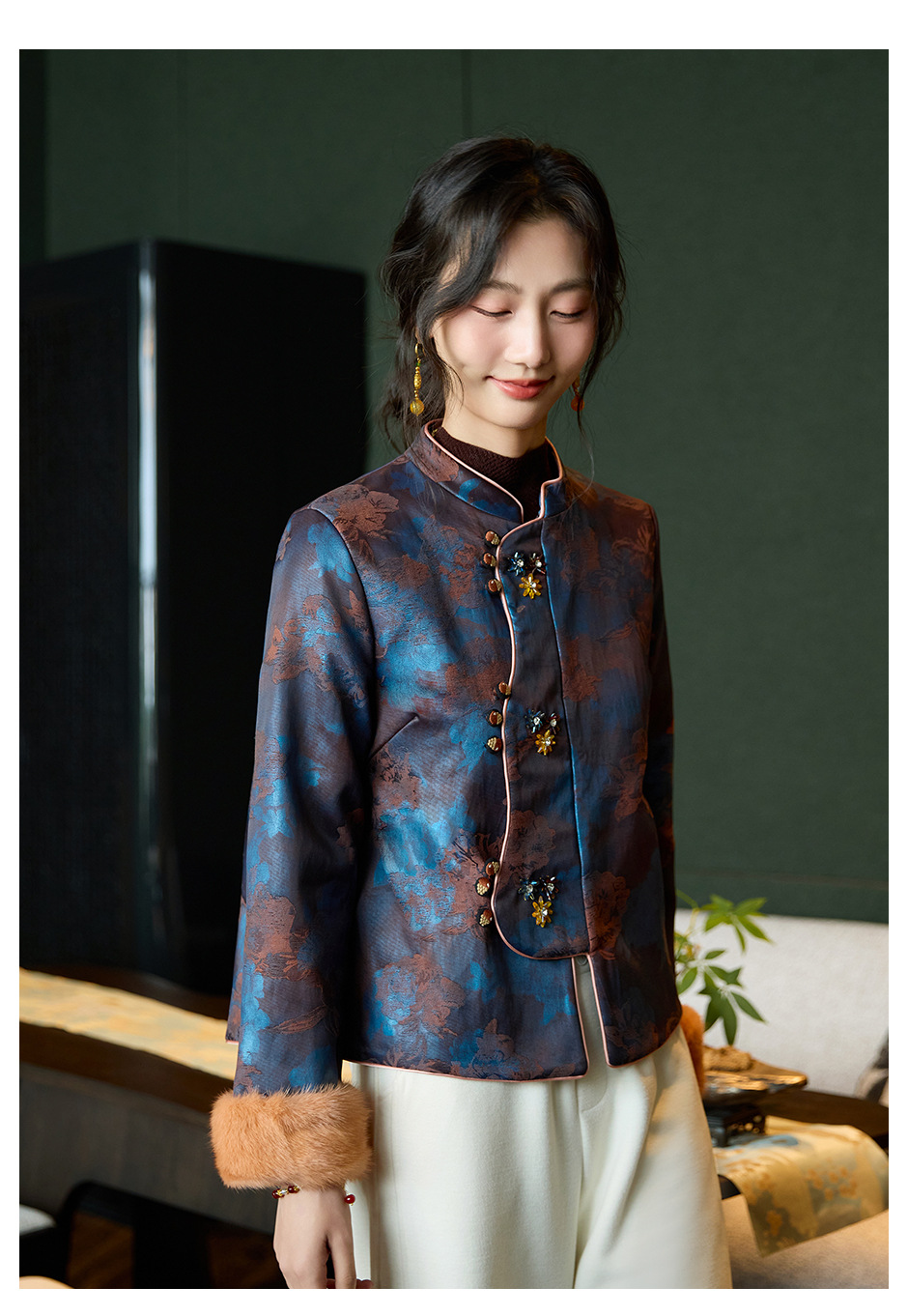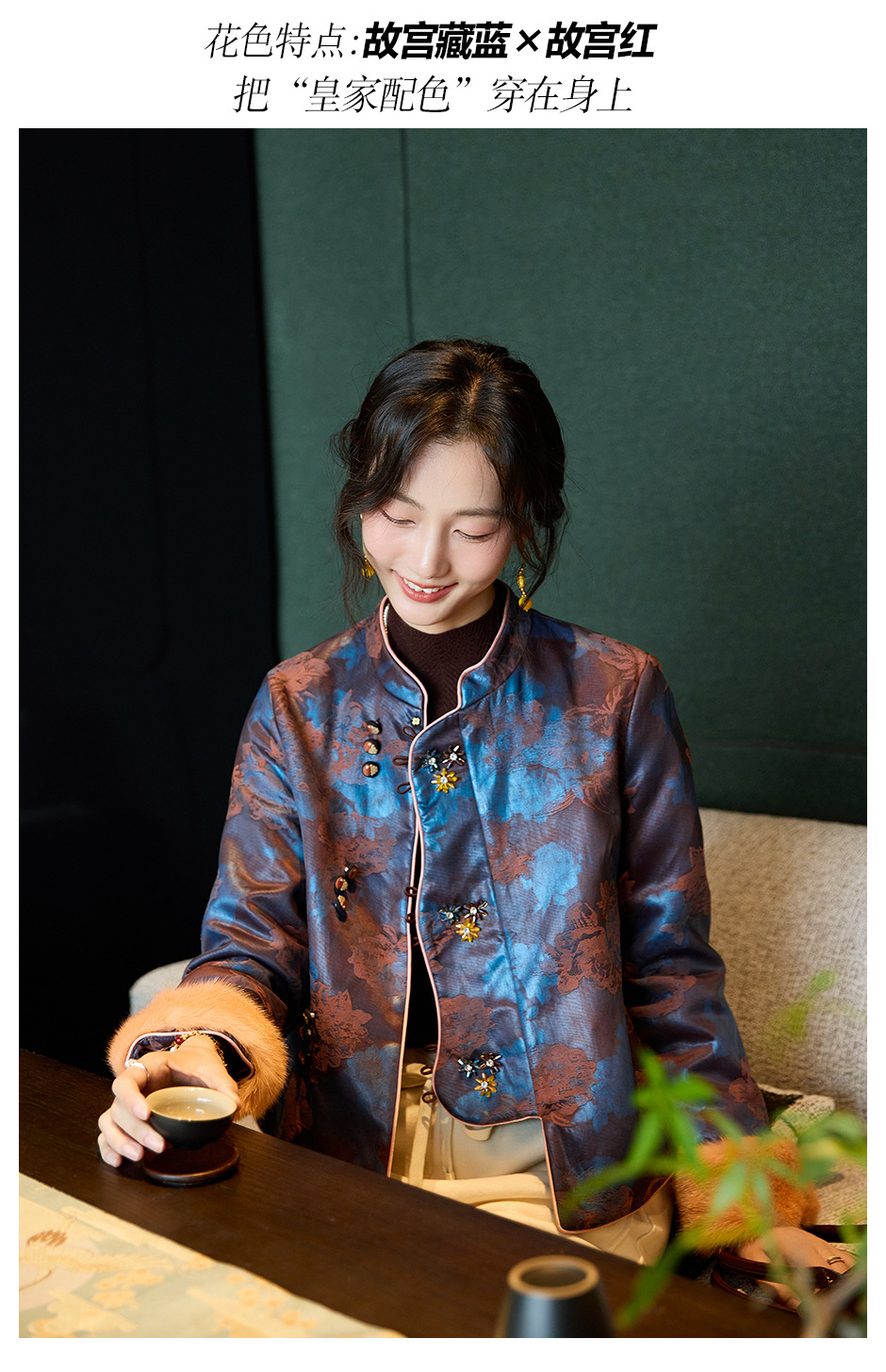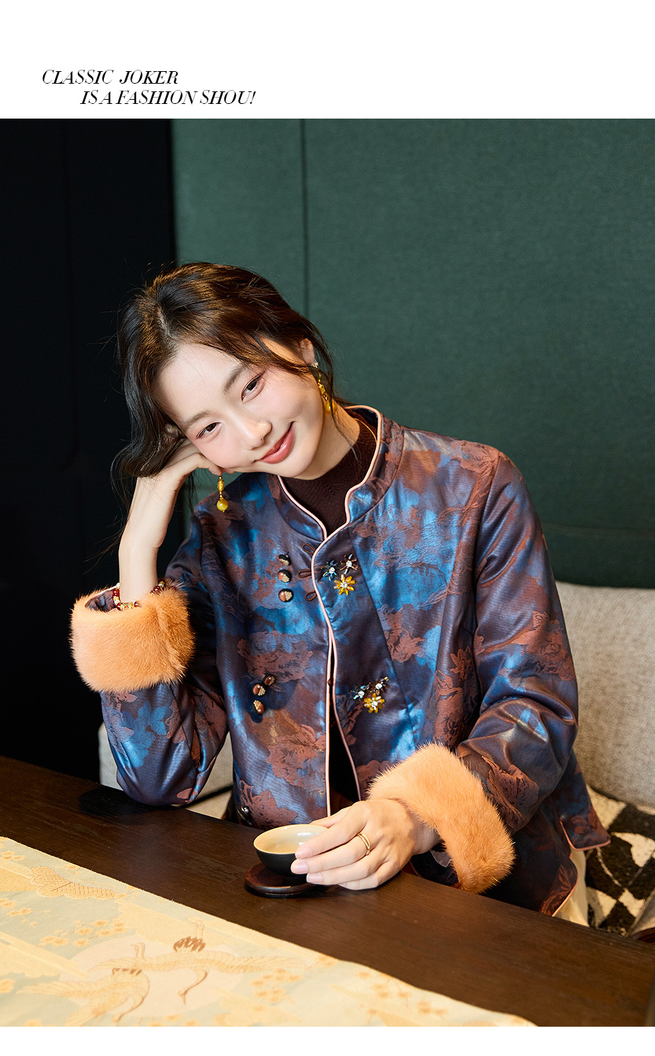 丁摩 水貂毛钉珠宋锦女秋冬新中式盘扣加厚保暖短款羊毛外套上衣5ZF-76051
