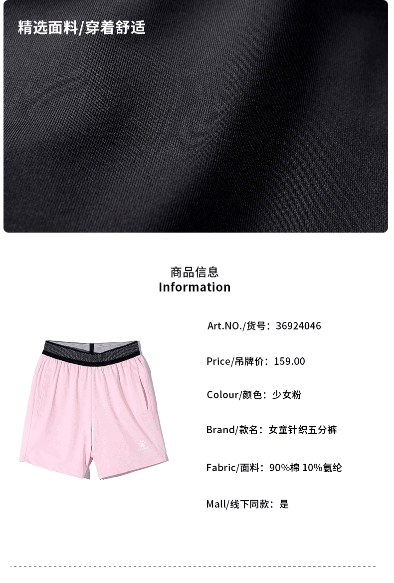 kelme(kids)童装中小女童针织时尚五分打底裤夏季中裤儿童