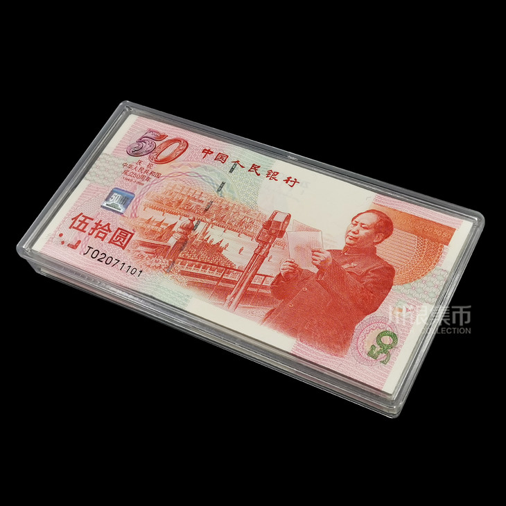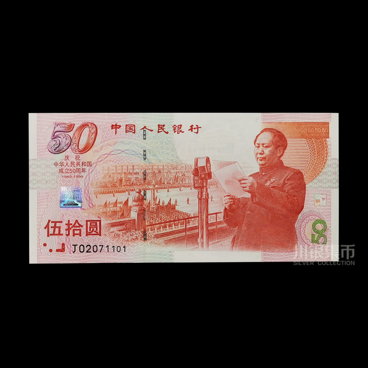【票面特征】主色调为红色,票幅长165毫米,宽80毫米。正面主景为开国大典盛况组合景,有天安门与“50”组合的动态全息图案,以盲文面额标记。