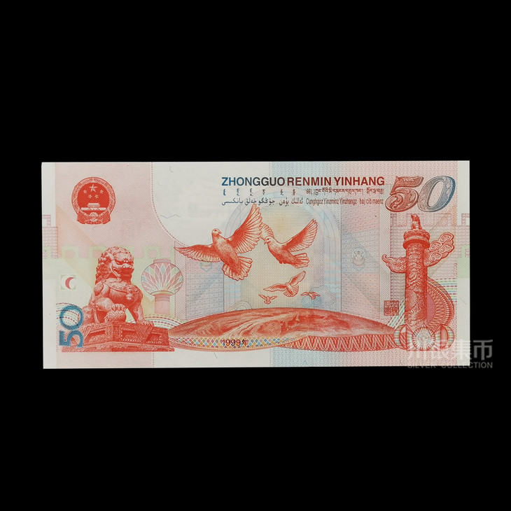 背面为地球、和平鸽、铜狮、华表等组合图景,刊中华人民共和国“国徽”“中华人民银行”汉语拼音字母和蒙、藏、维、壮四种民族文字的“中国人民银行”字样和面额。