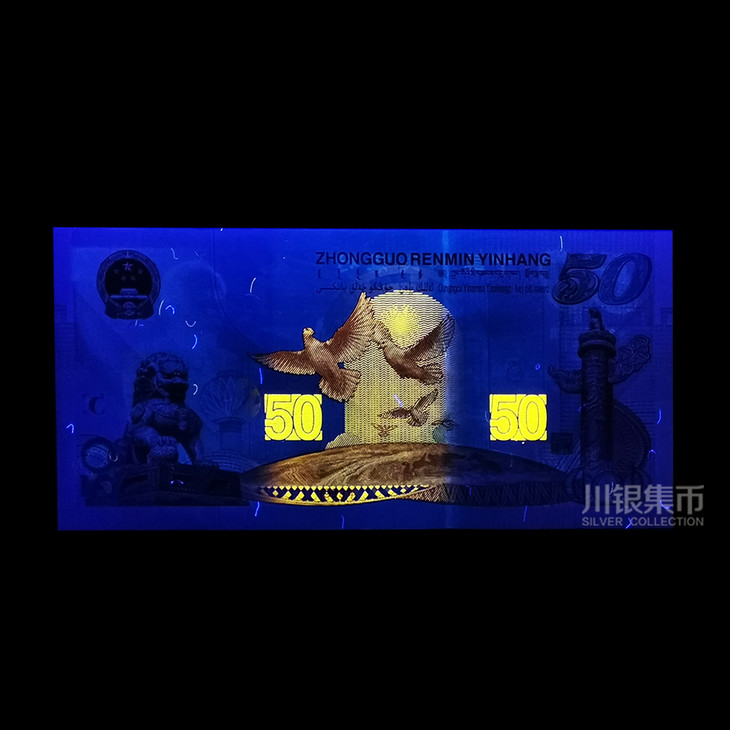 4.无色荧光油墨印刷图案:背面中间胶印底纹处,在特定波长的紫外光下,可以看到两个“50”字样,该图案采用无色荧光油墨印刷可供机读。
