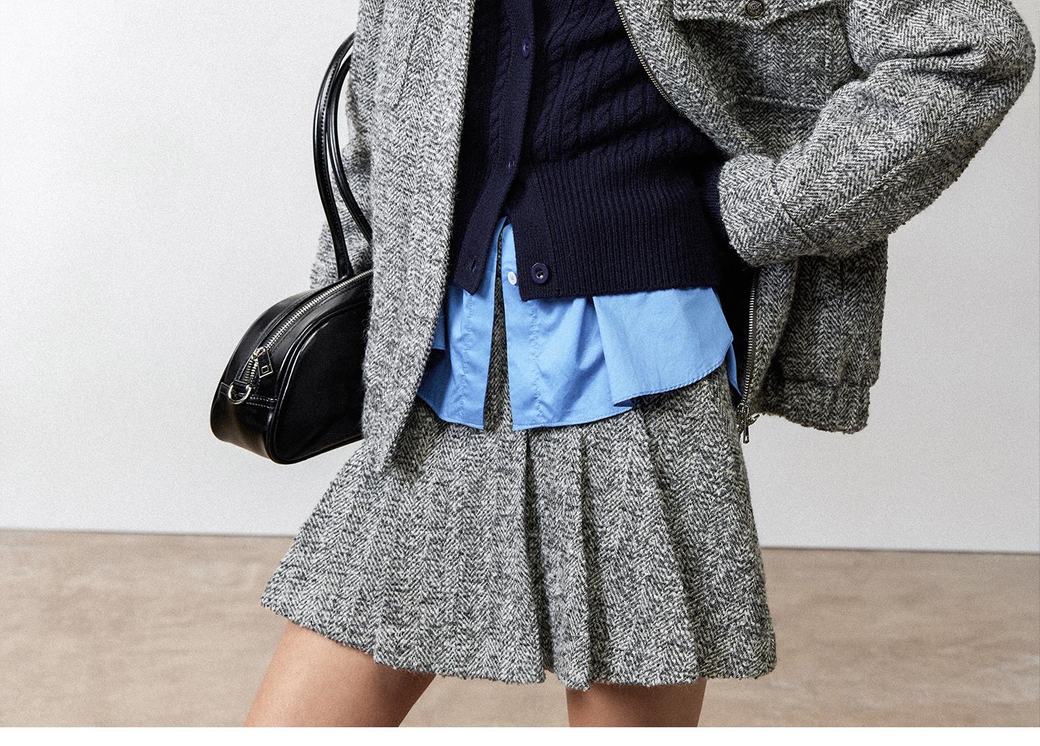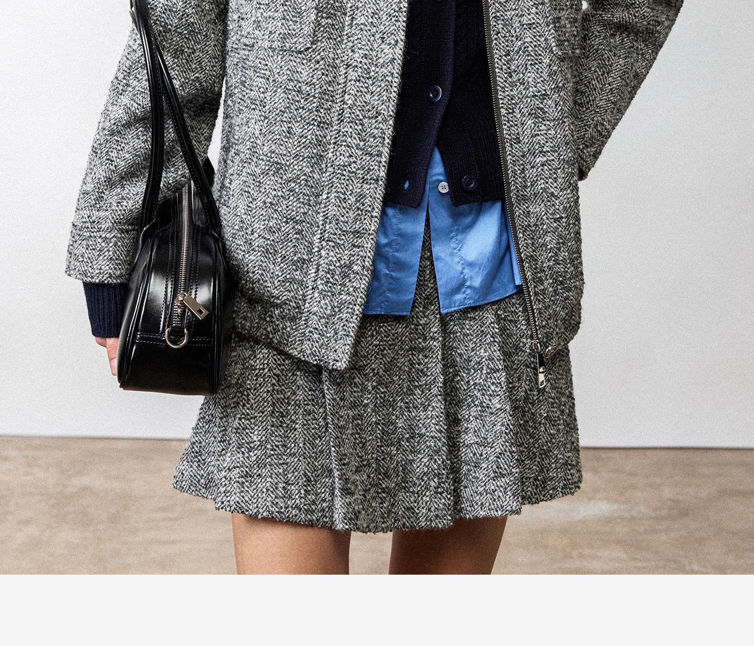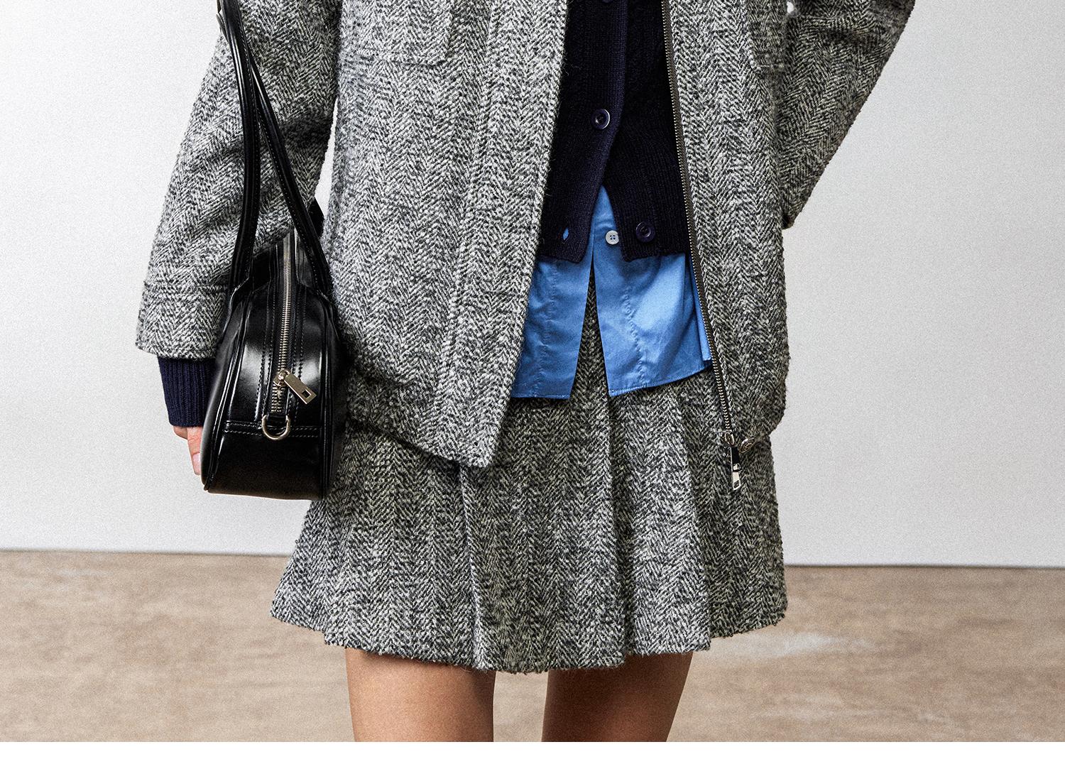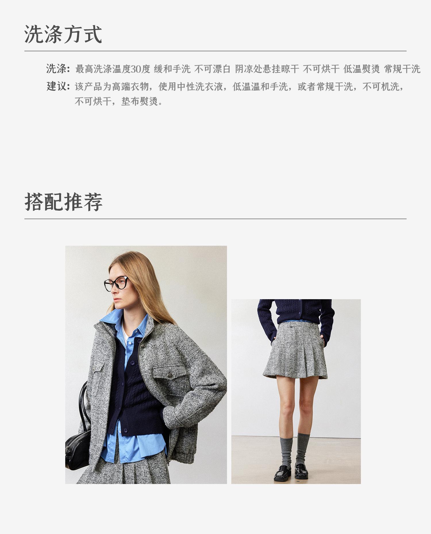 西嘉羊驼羊毛圈圈纱 粗纺呢人字纹MIU系夹克外套/百褶半裙女套装(货号:WT2404026)