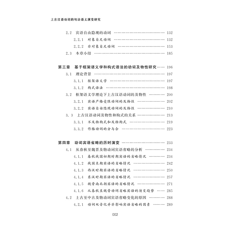 为了解决这些问题,本书首先通过调查研究揭示上古汉语时期动宾关系的基本面貌,广泛调查研究动词和宾语的句法语义关系,揭示宾语隐现的规律,发掘上古汉语动词和宾语语义关系的基本情况;基于框架语义学与构式语法理论,探讨上古汉语动词及物性相关问题;在此基础上梳理从春秋时期到魏晋南北朝时期动词宾语省略情况的历时演变规律,探索影响动词宾语省略变化的内部因素。