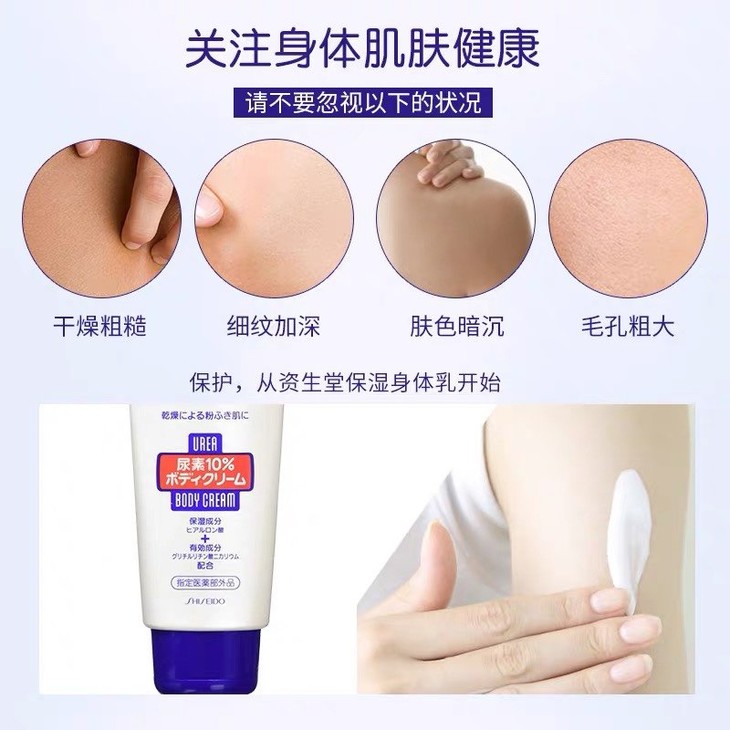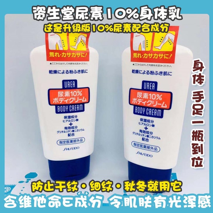 资生堂尿素10%身体乳👍这是升级版10%尿素配合成分⬆,身体、手足一瓶到位😊!富含尿素、玻尿酸等保湿💦美肤成分,针对手臂💪、小腿和大腿等角质层偏厚的部位😶,软化角质,🙅告别尴尬蛇皮和干裂。长期使用能使这些部位肌肤更加娇嫩饱满😚。含维他命E成分,令肌肤有光泽感🌟,富有弹性。有效被肌肤吸收,并且有较强的修复功效👀,防止干纹、细纹,秋冬就用它🍁!