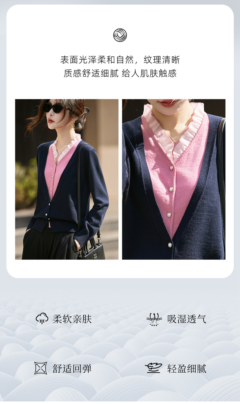 丁摩 假两件针织开衫女秋冬新款V领蕾丝拼接上衣5203 商品图4