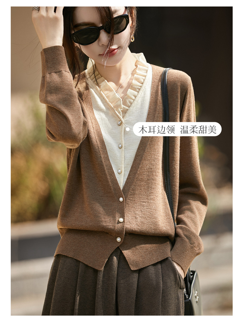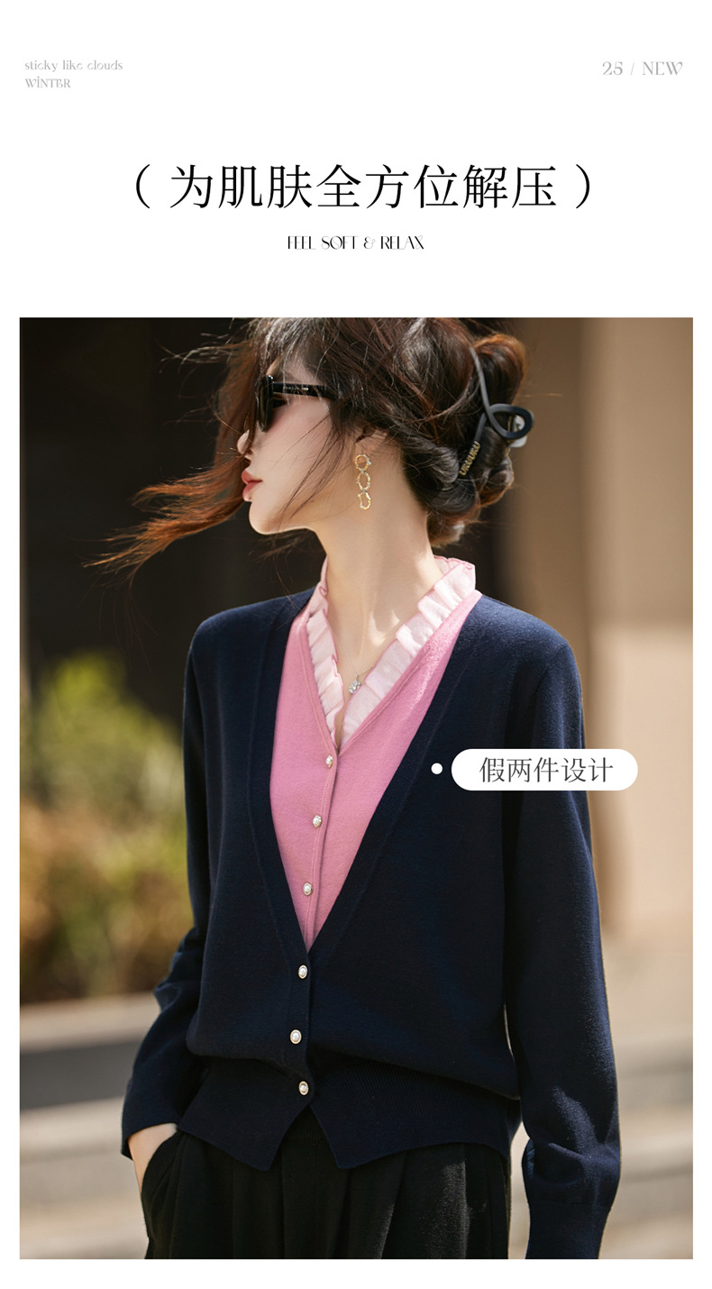 丁摩 假两件针织开衫女秋冬新款V领蕾丝拼接上衣5203 商品图0