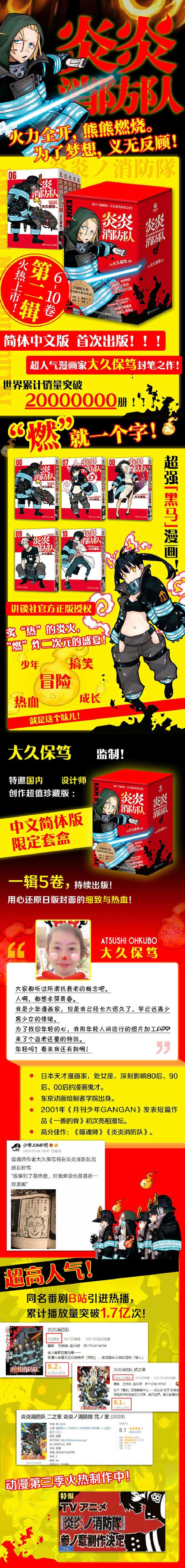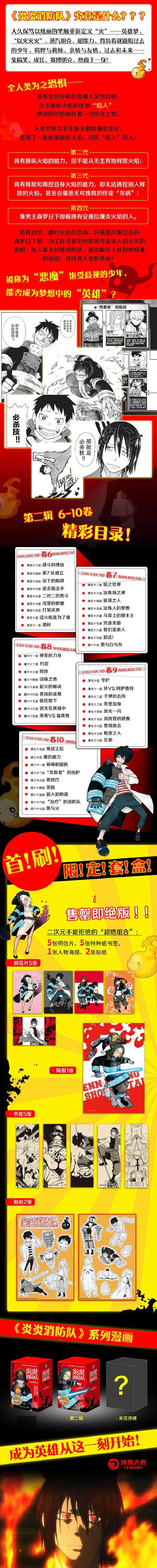 1.“燃”就一个字!讲谈社超强“黑马”热血漫画!《炎炎消防队·第二辑》(6-10册)简体中文版引进出版! 一辑5册,第二辑6-10卷。讲谈社官方正版授权,少年+热血+冒险,就是这个味儿! 2.火力全开,熊熊燃烧,为了梦想,义无反顾!成为英雄从这一刻开始! 集搞笑、成长、赛博朋克、热血于一身的人气漫画——被称为“恶魔”饱受歧视的少年,能否成为梦想中的“英雄”?! 3.,大久保笃封笔之作,再创实力口碑佳作神话。 大久保笃,凭借《噬魂师》《炎炎消防队》两部作品,深刻影响80后、90后、00后的漫画鬼才。 4.超高人气!B站引进热播同名番剧《炎炎消防队》,累计观看量突破1.69亿次,第三季火热制作中! 5.《炎炎消防队》系列作品,世界累计销量怒破2000万册,高分口碑佳作热销! 6.强强联合! 7.译本考究!专业漫画汉化组K.W翻译组倾力译作。 8.首!刷!限!定!套!盒!随书附赠超值礼品——二次元不能拒绝的“超燃组合”,5张明信片、5张特种纸书签、1张人物海报、2张贴纸……! 9.“燃”就一个字!为了梦想,义无反顾!集搞笑、成长、热血于一身的超高人气漫画——被称为“恶魔”饱受歧视的少年,能否成为梦想中的“英雄”?!