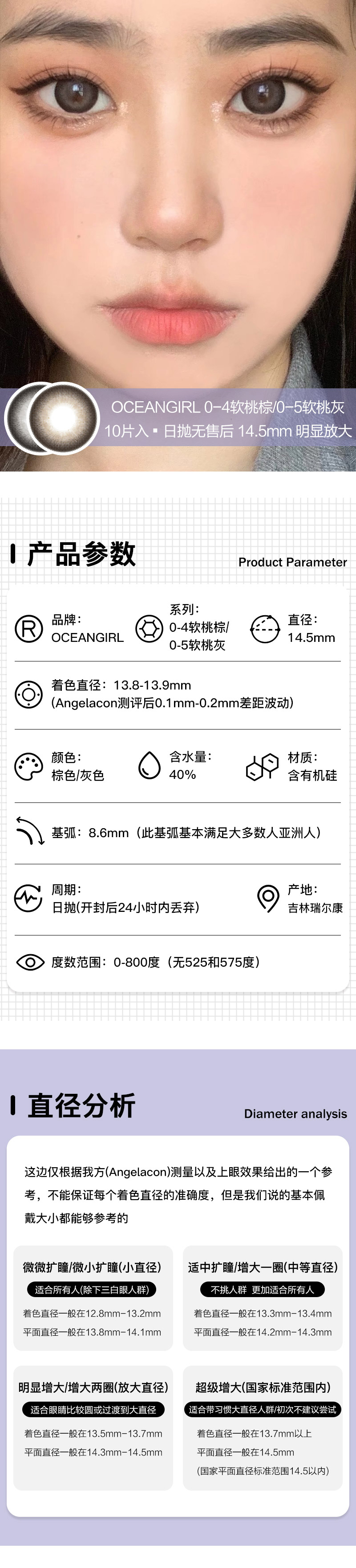 OCEANGIRL | 0-4软桃棕/0-5软桃灰 | 10片入 | 美瞳日抛 | 无售后 | 14.5mm | 明显放大