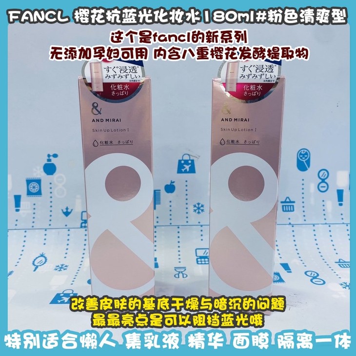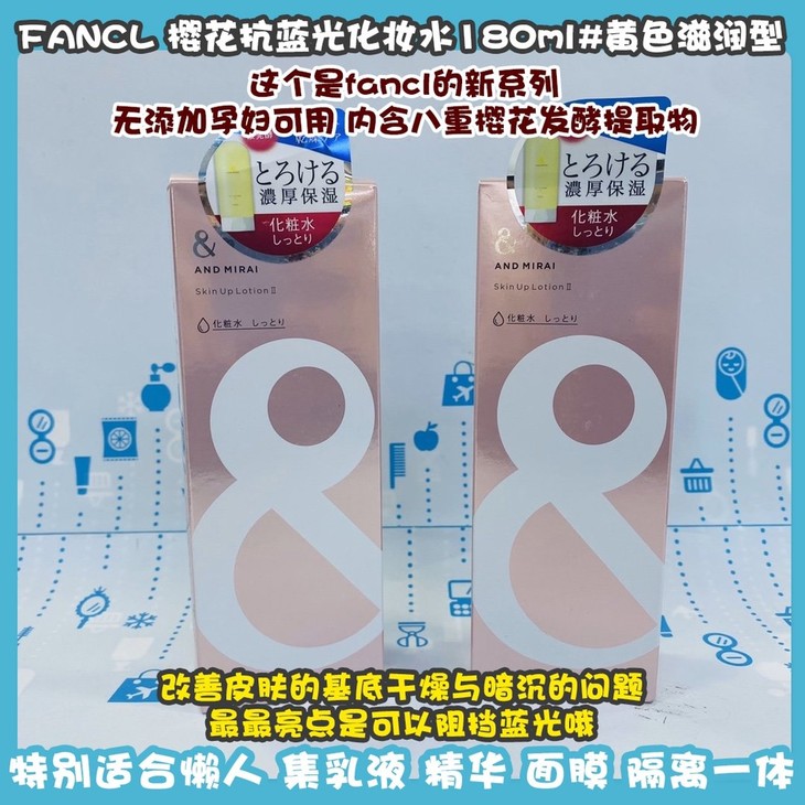 FANCL 樱花抗蓝光化妆水180ml#粉色清爽型/#黄色滋润型👍这个是fancl的新系列😍,无添加孕妇可用。内含八重樱花发酵提取物🌸,改善皮肤的基底干燥与暗沉的问题。🌟最最亮点是可以阻挡蓝光哦,针对新一代年轻人,👉所以特别适合使用手机📱,电脑💻频率很高的人群。同时又有抗初老功效👊,对于平时生活习惯不太好,睡眠不足🌙等导致的肌肤问题都可以改善!坚持使用肌肤会变的很弹润〽,抹开后会化水,特别适合懒人,集乳液、精华、面膜、隔离一体‼