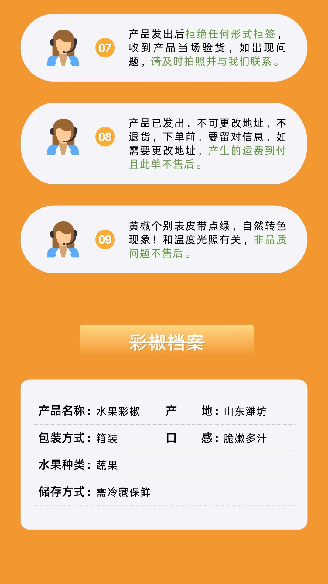 品名:水果彩椒,发京东规格1:3斤规格2:4.5斤 备注:3斤约6个,4.5斤约9个,具体以重量为准 包装方式:纸箱+网套 快递:京东快递 运费模板:新疆、西藏、海南、青海、港澳台不发货,其他区域包邮 发货时效:48-72h 发货地/产地:山东潍坊 保质期:收到后常温保存3-5天,冷藏保鲜5-7天 生产日期:现摘现发 销售售卖期:5月中旬 周六周天、节假日除外,早上十点之前的订单是48小时发货 ,到货时间约为2-5天,请您耐心等待 |