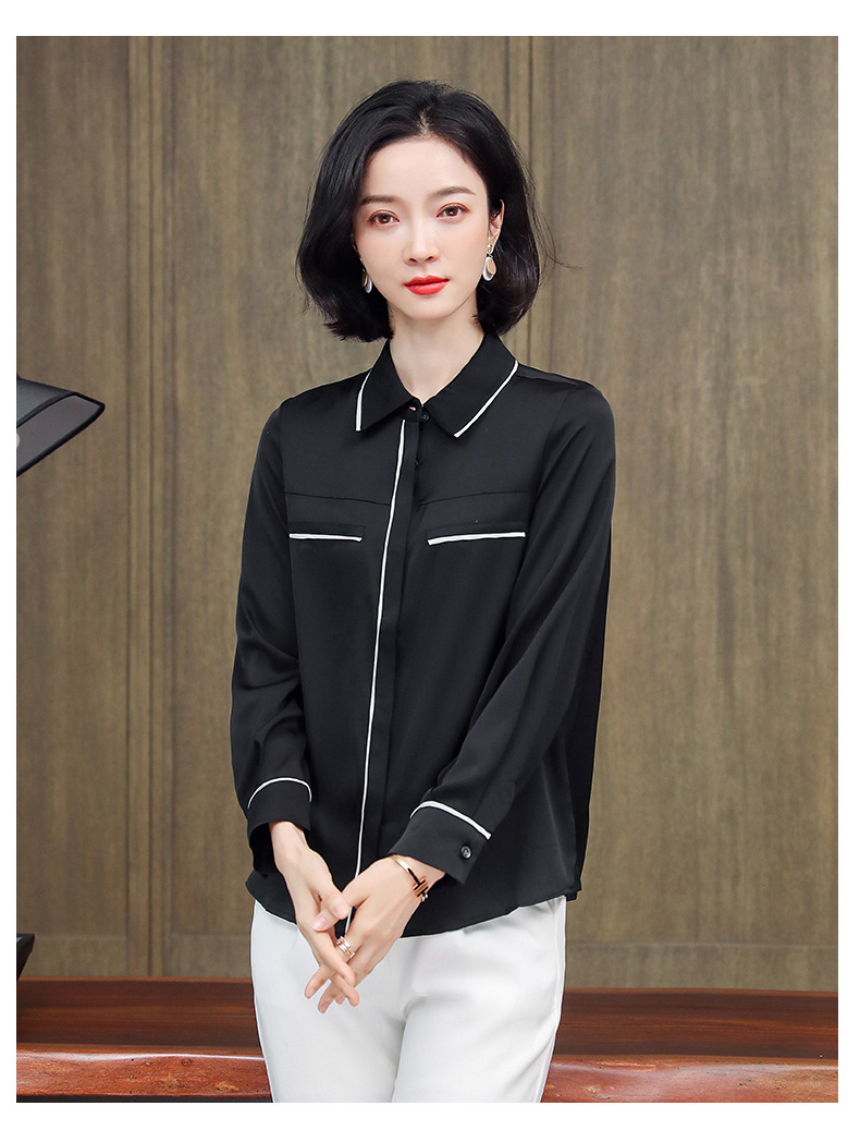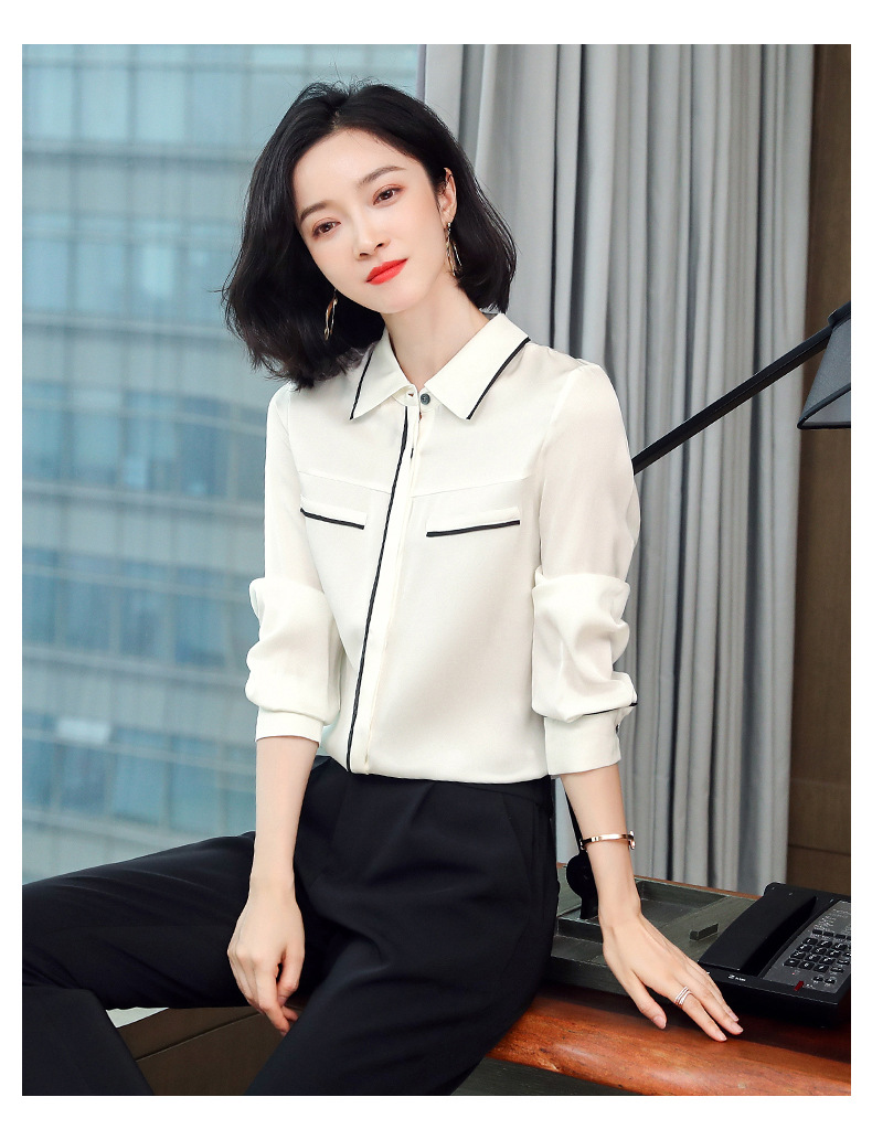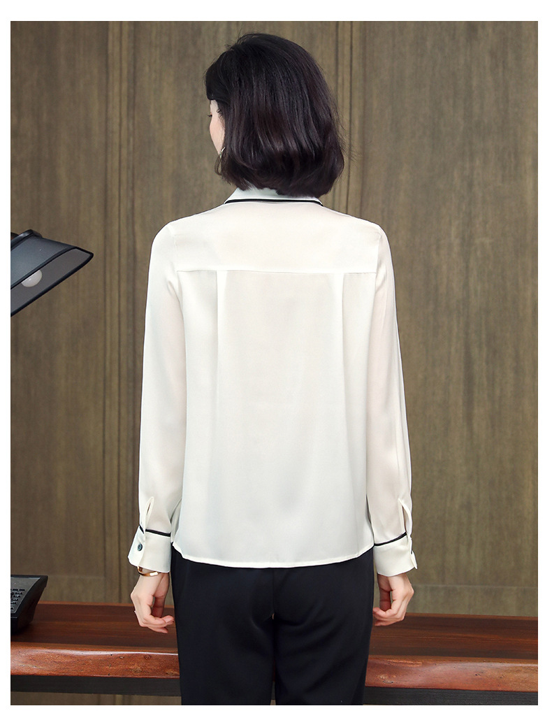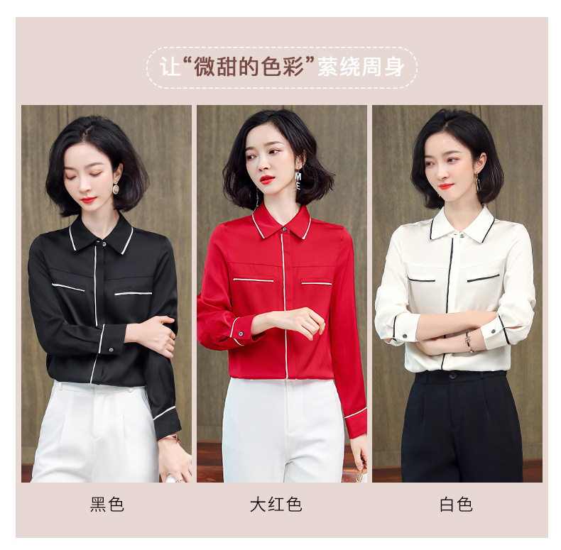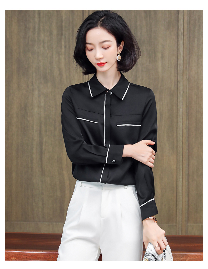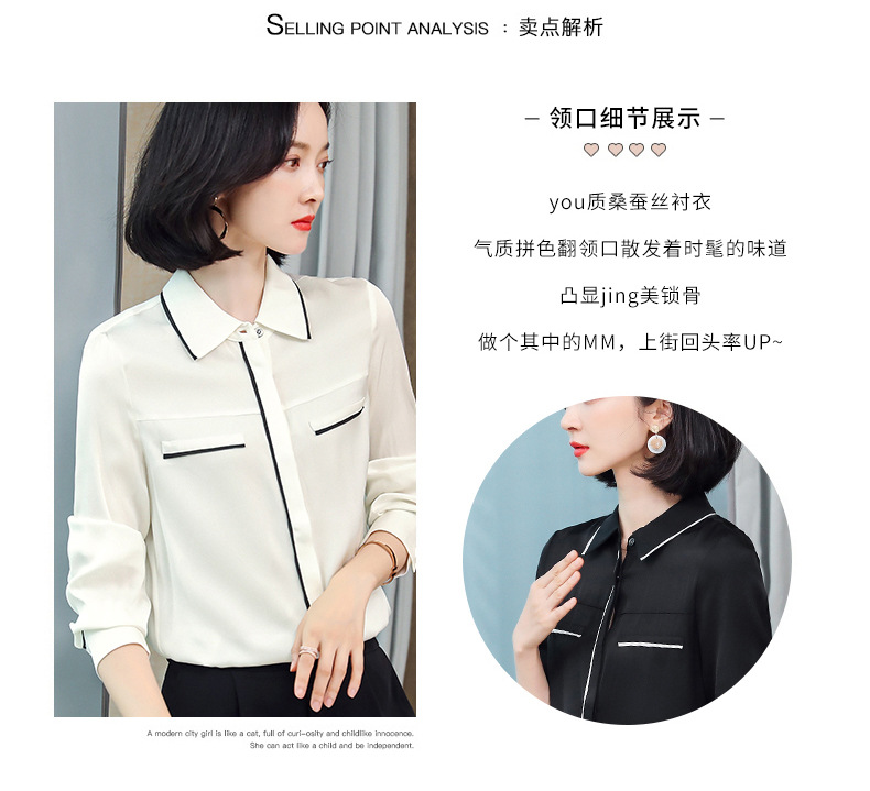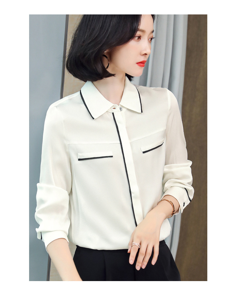 ASE-3377桑蚕丝衬衫女重磅欧货翻领拼色百搭隐形单排扣衬衫女春秋