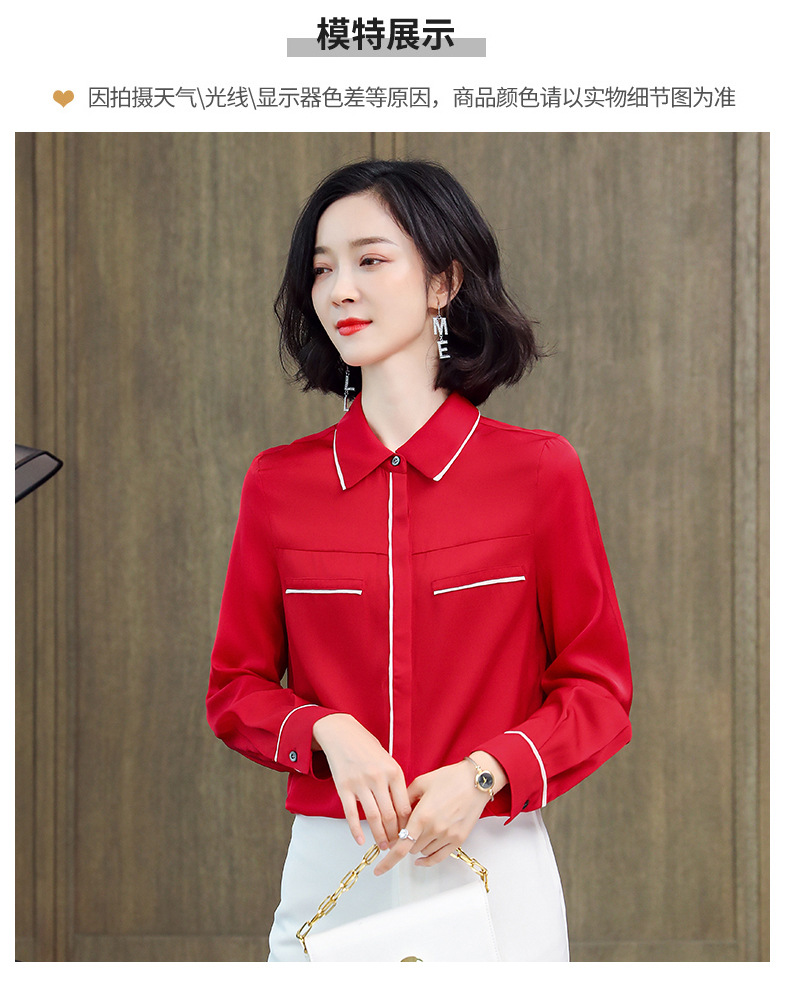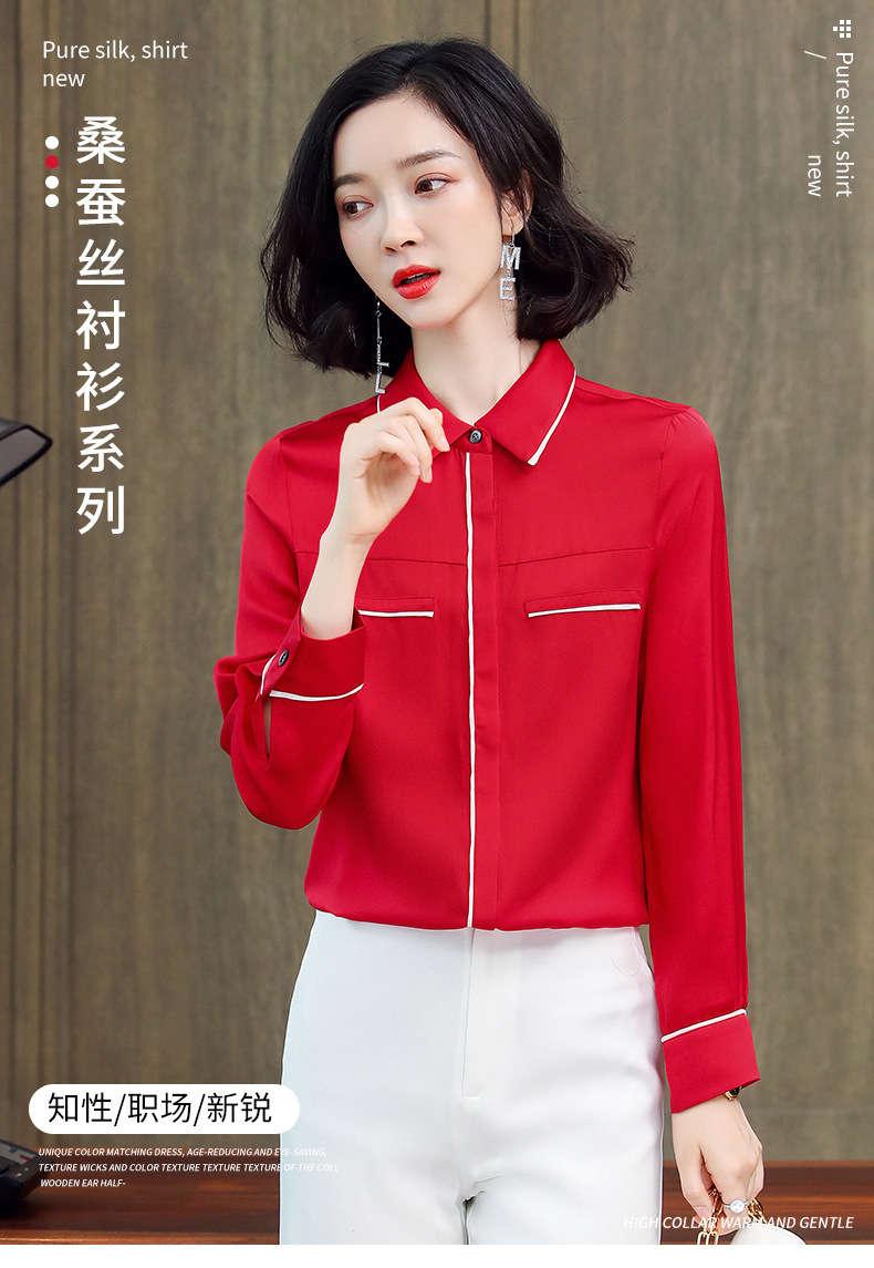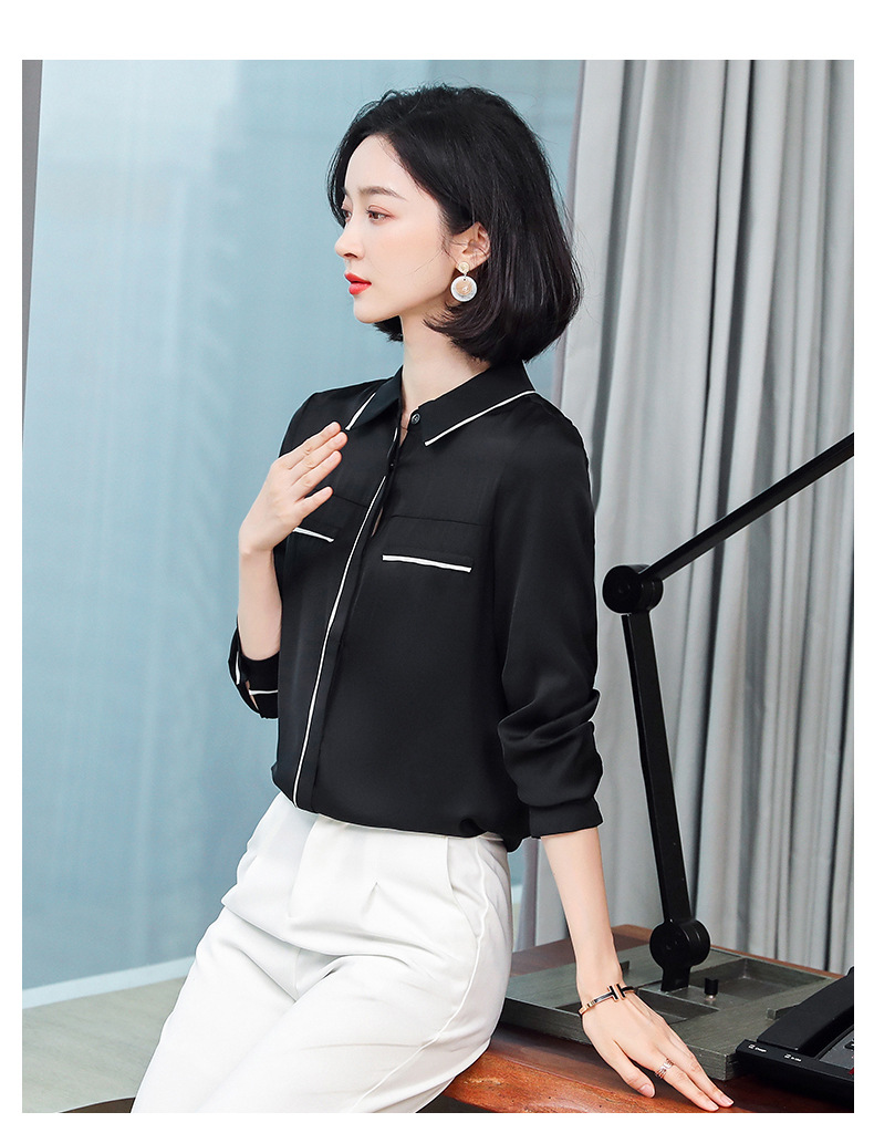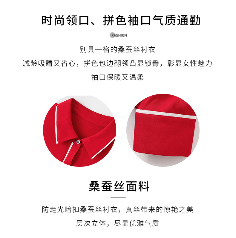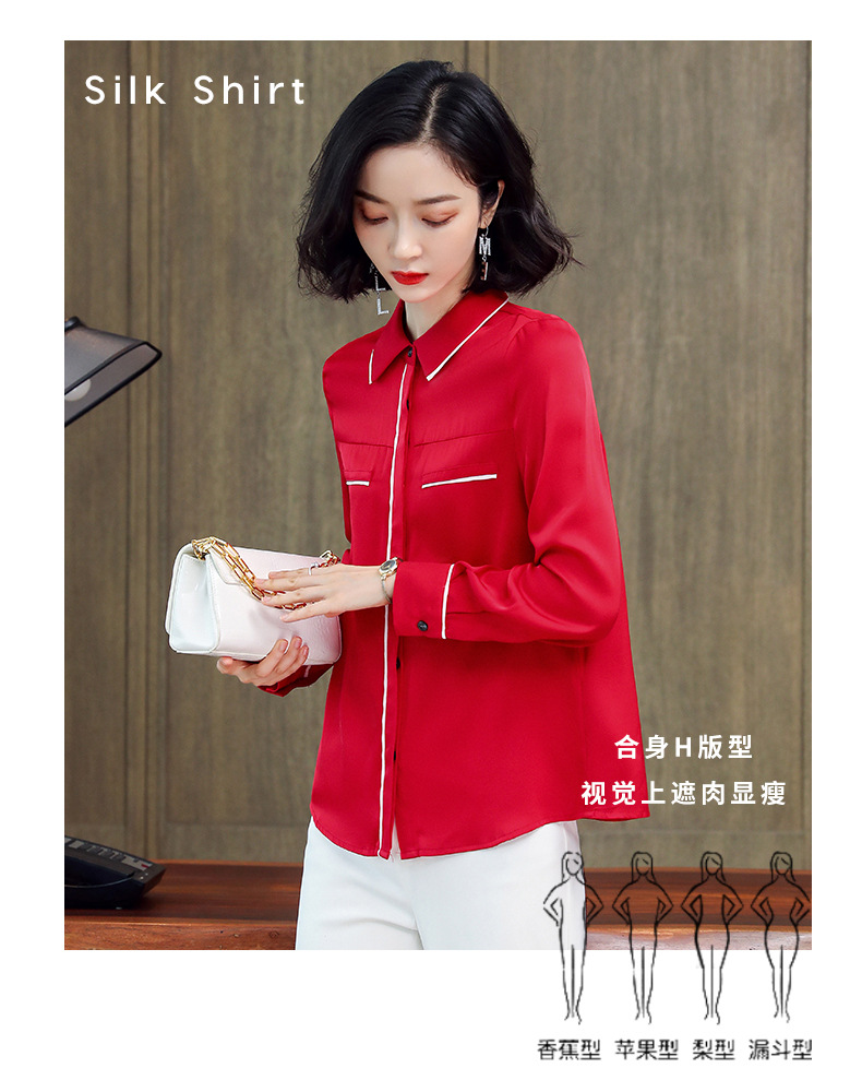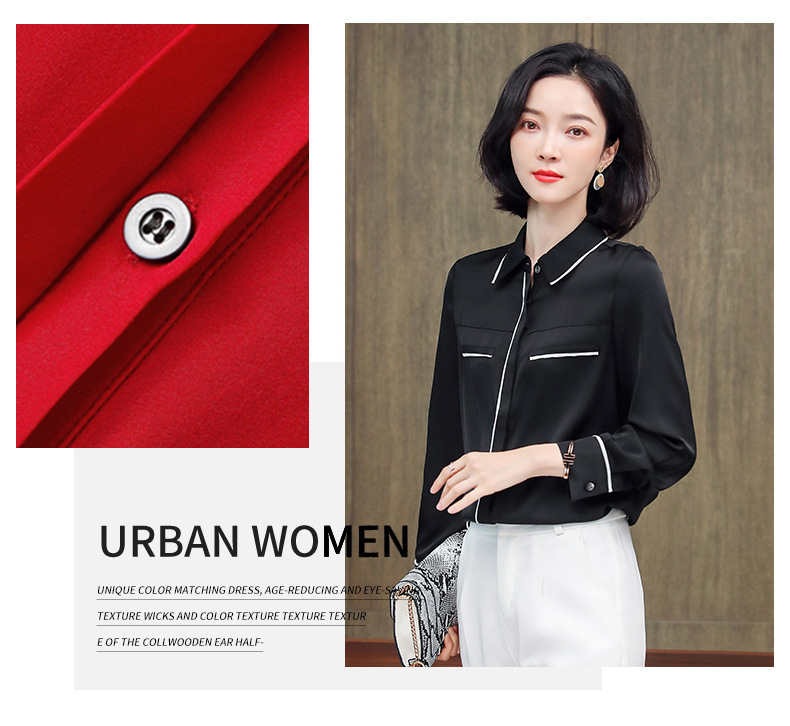 ASE-3377桑蚕丝衬衫女重磅欧货翻领拼色百搭隐形单排扣衬衫女春秋