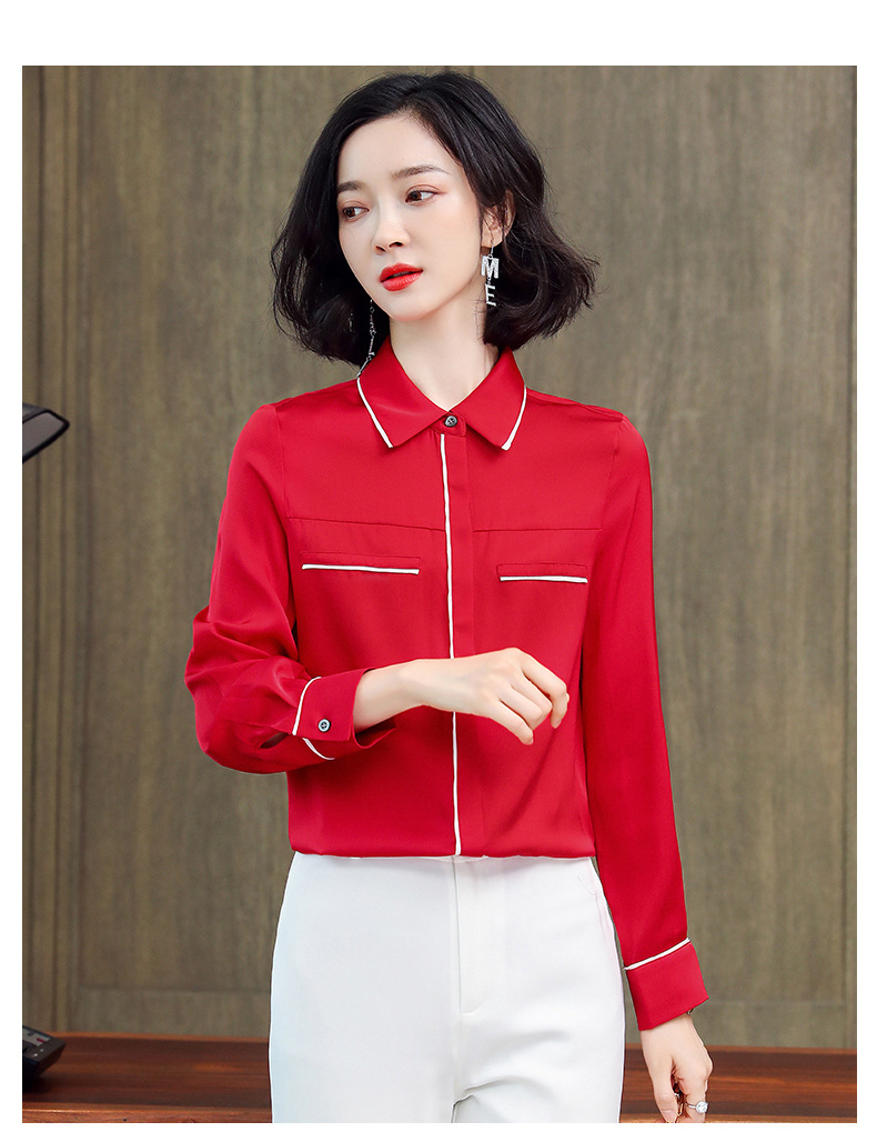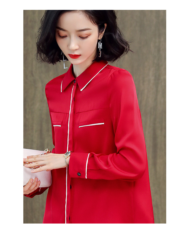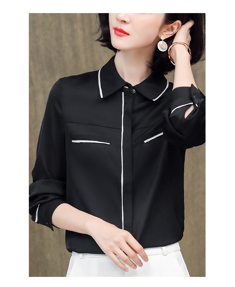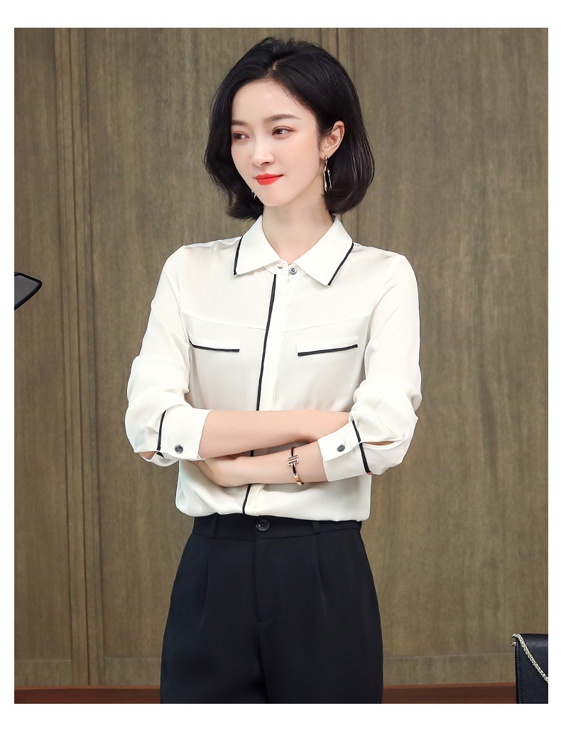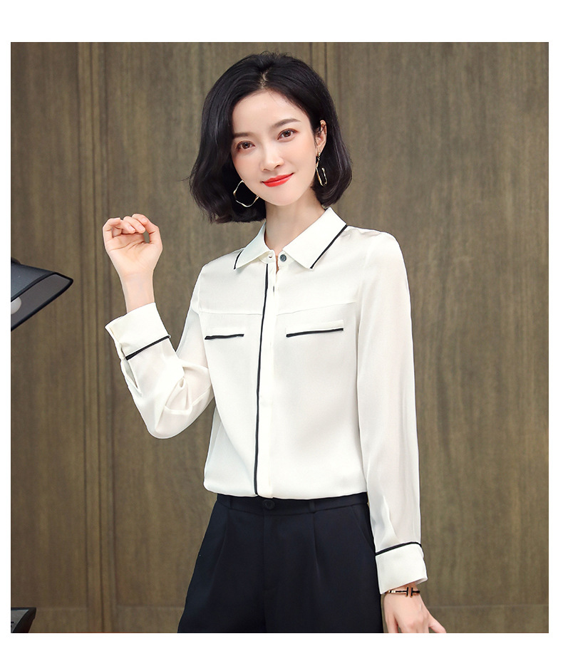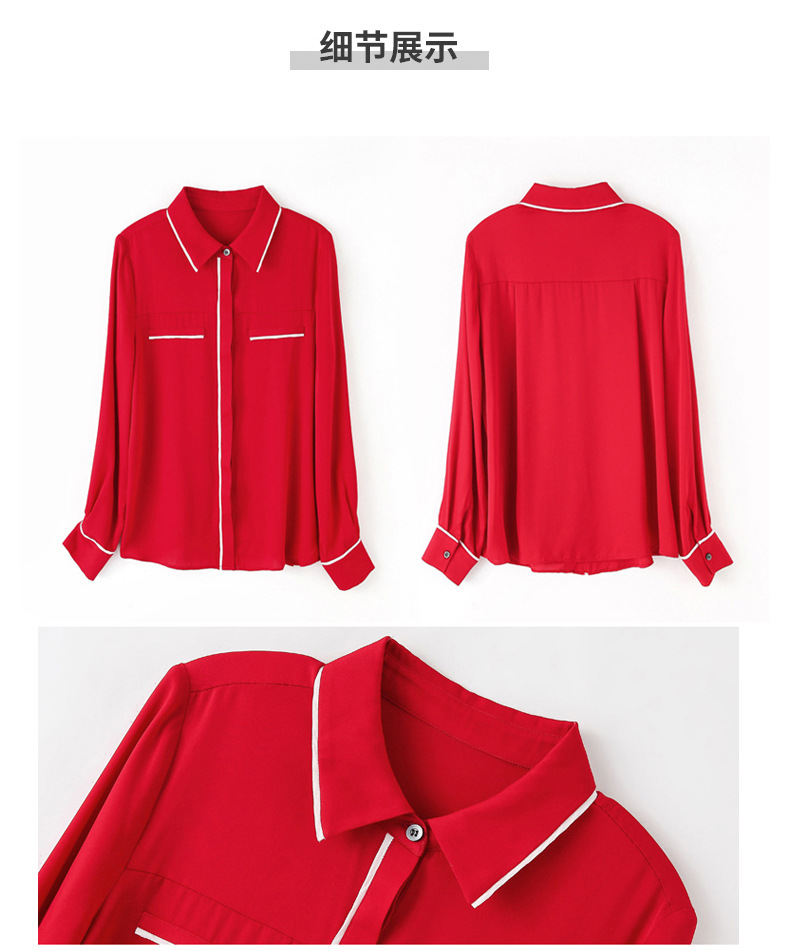 ASE-3377桑蚕丝衬衫女重磅欧货翻领拼色百搭隐形单排扣衬衫女春秋