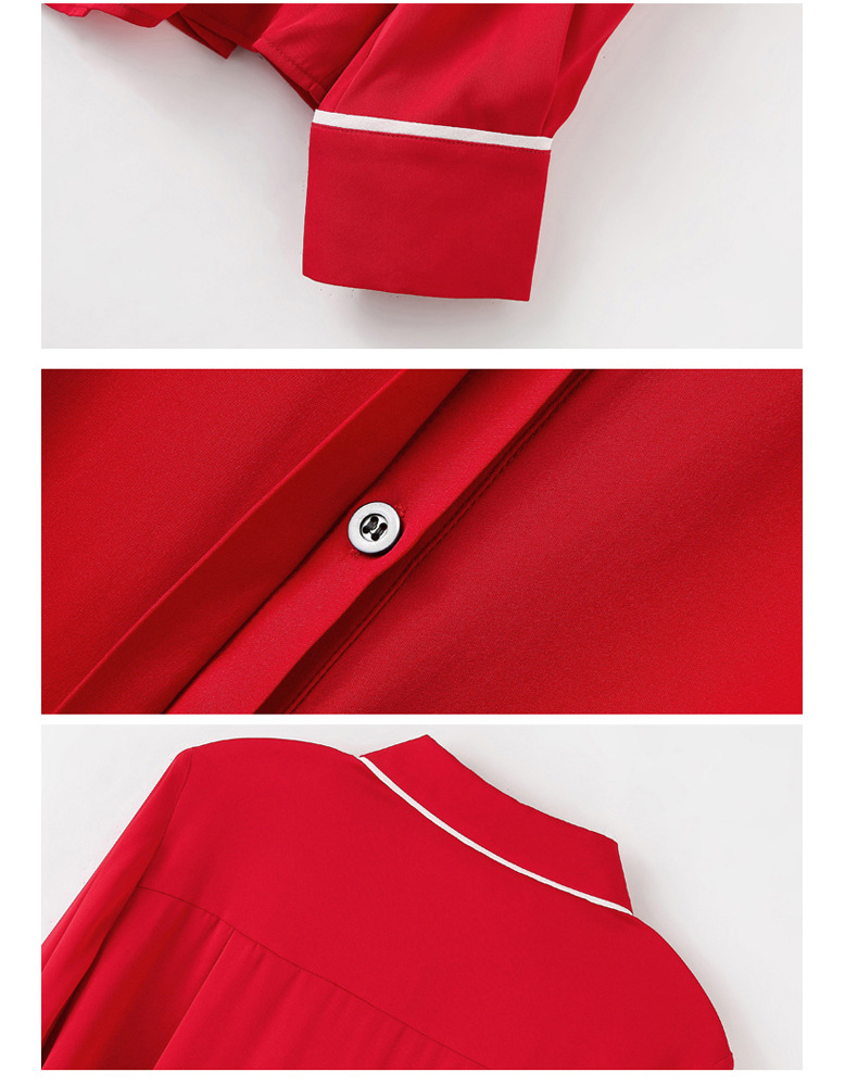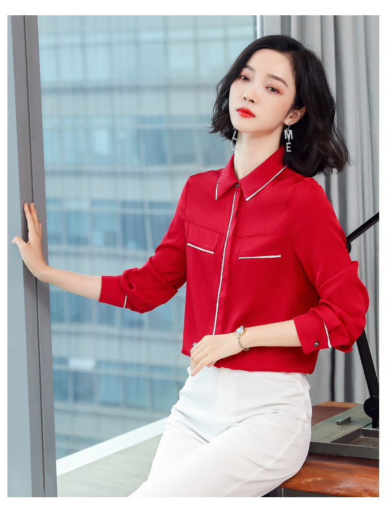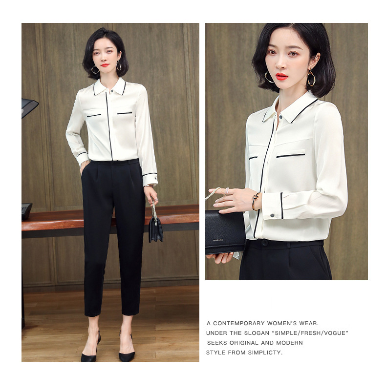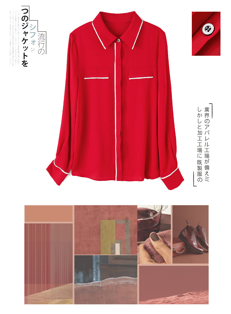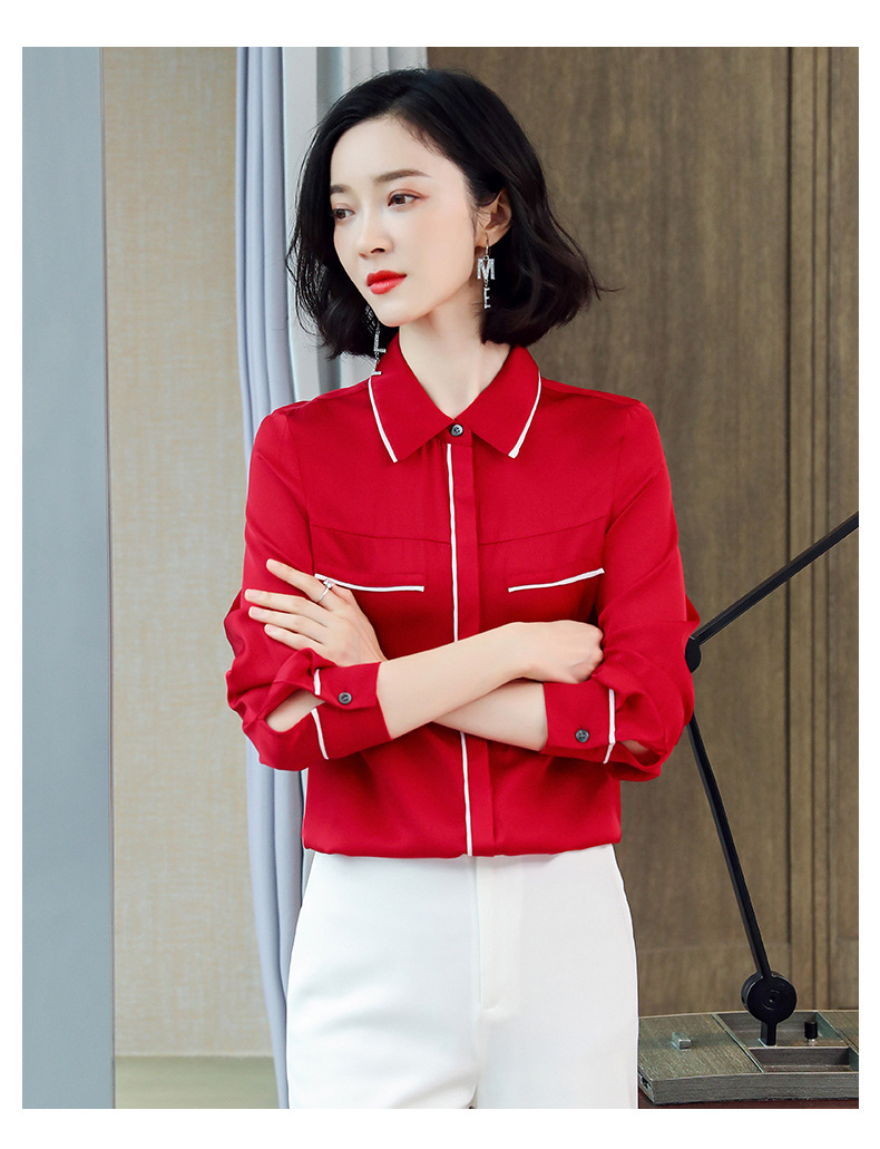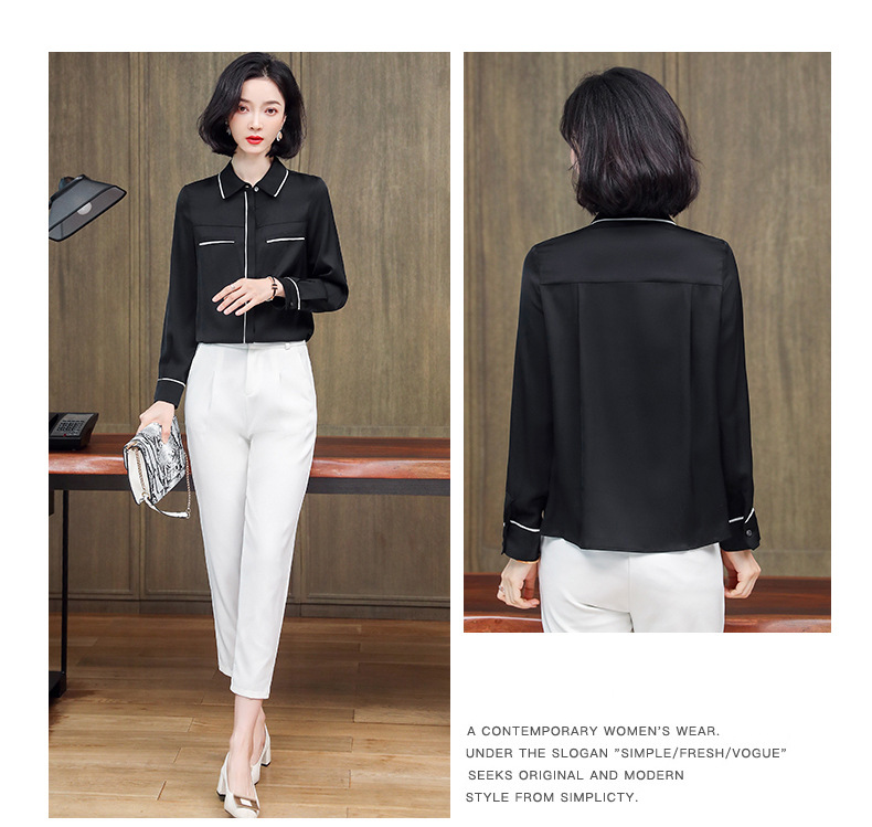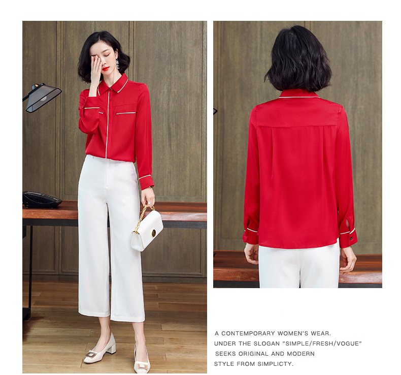 ASE-3377桑蚕丝衬衫女重磅欧货翻领拼色百搭隐形单排扣衬衫女春秋