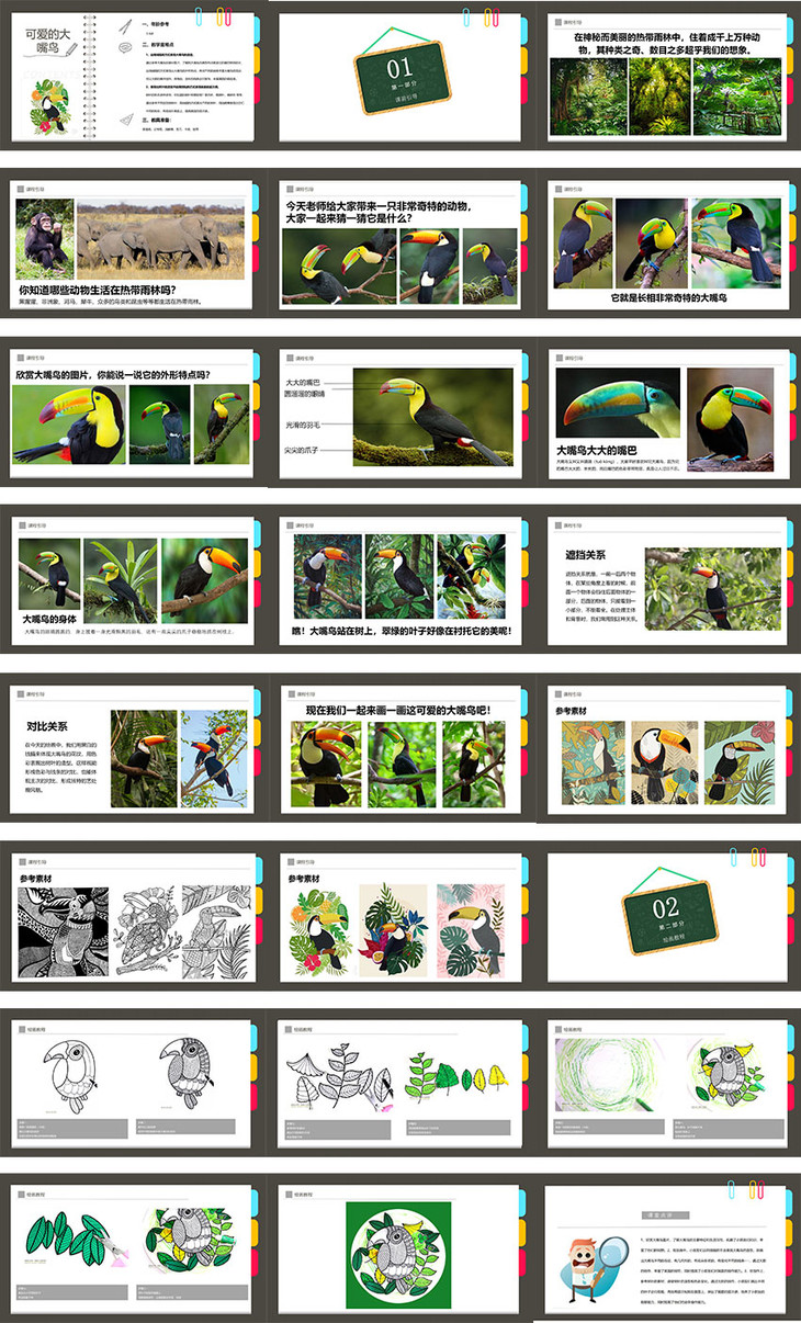 通过参考大嘴鸟的素材图片,了解到大嘴鸟的典型特点就是它的嘴巴特别的大,运用线描的方式表现出大嘴鸟的外形特点,再用不同的线条丰富大嘴鸟的花纹,可以大胆的展开创作,用弯曲、变形的线条进行装饰,丰富画面的视觉感。