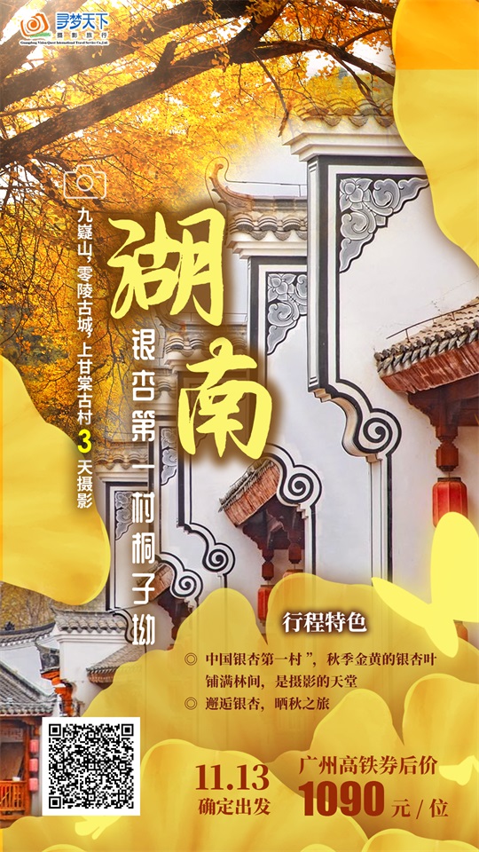 G6072(08:30-11:52)高铁前往永州双牌县桐子坳村。古银杏林:被誉为“中国银杏第一村”,秋季金黄的银杏叶铺满林间,是摄影的天堂。可以拍摄银杏林的全景、特写以及人物与银杏的互动。步瀛桥:横跨谢沐河的宋朝古迹,是进入古村的重要通道,也是绝佳的拍照圣地。