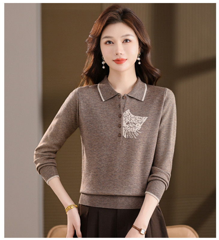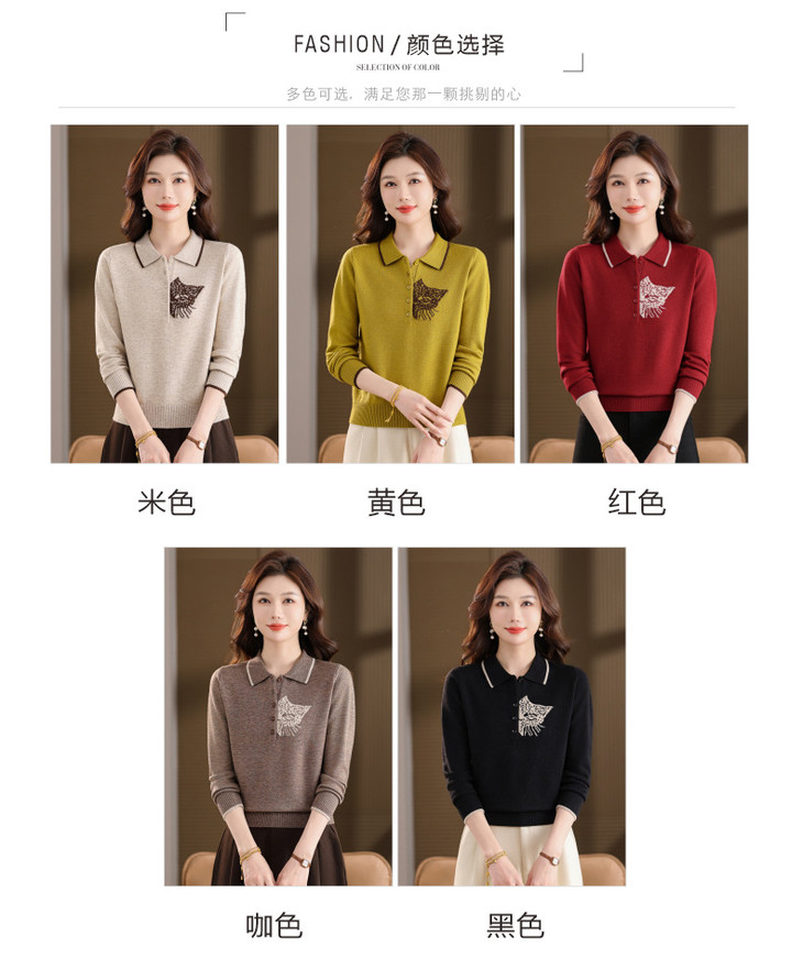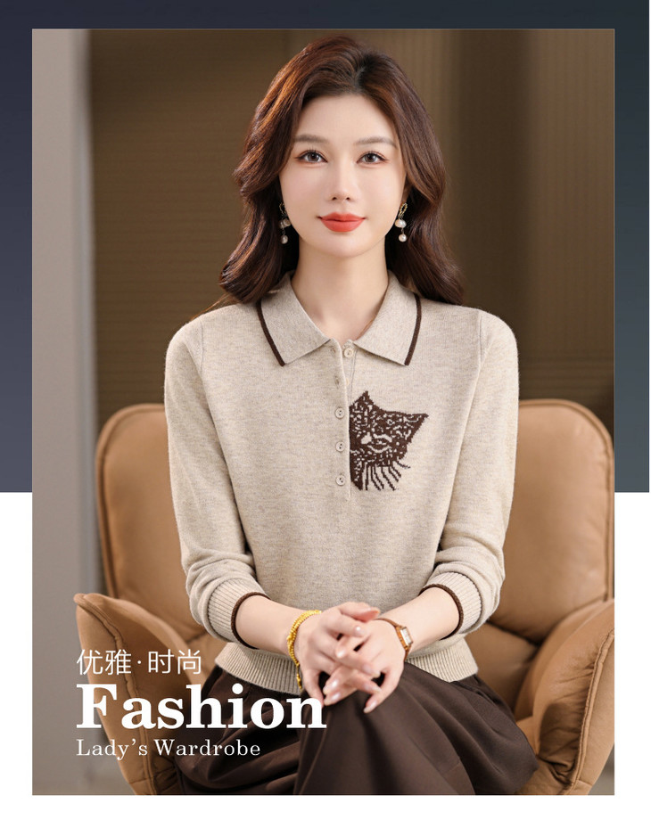 法式优雅撞色翻领针织衫,猫咪刺绣显瘦长袖毛衣CC-QQH-9233