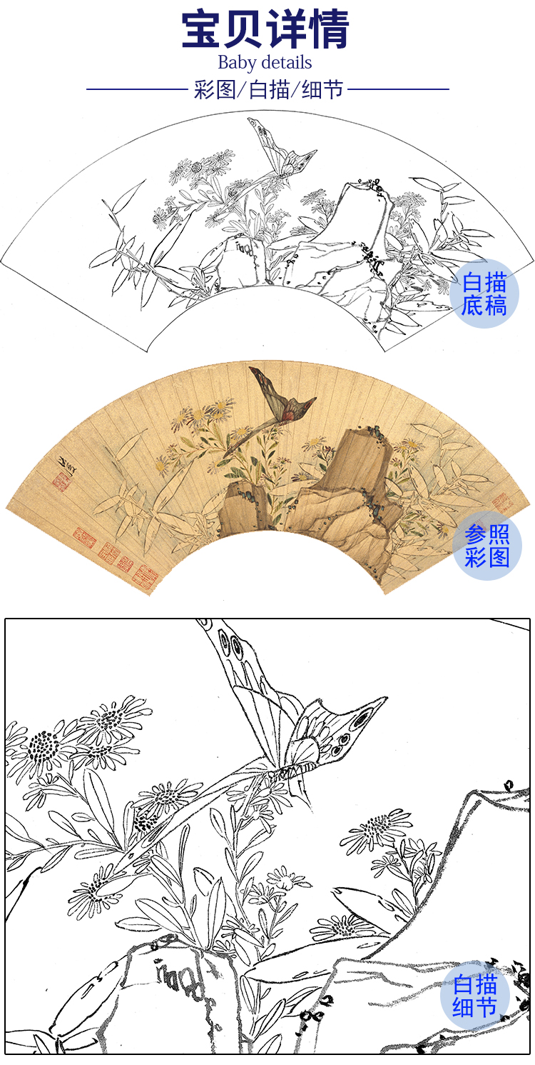 工笔画白描底稿 花鸟扇面小品 明 陈洪绶-《林亭清话图》-多种白描尺寸可选-SR02