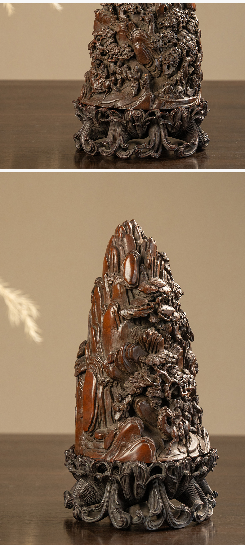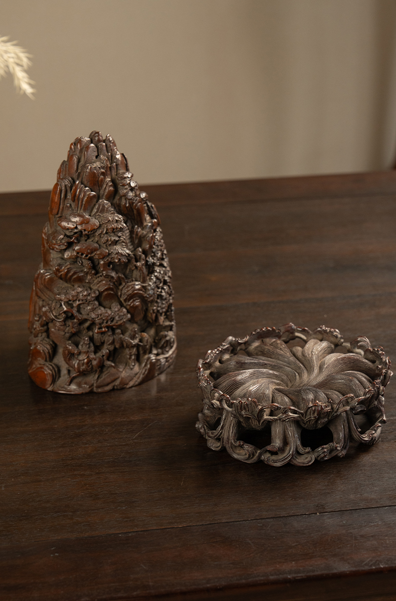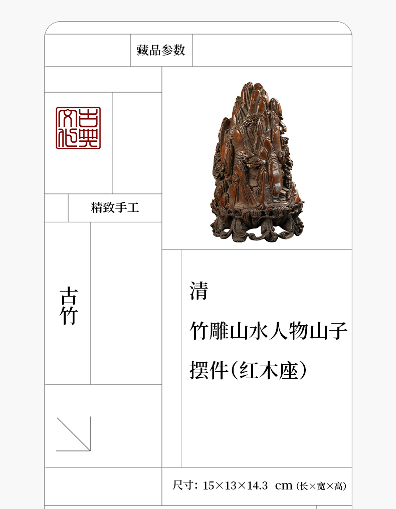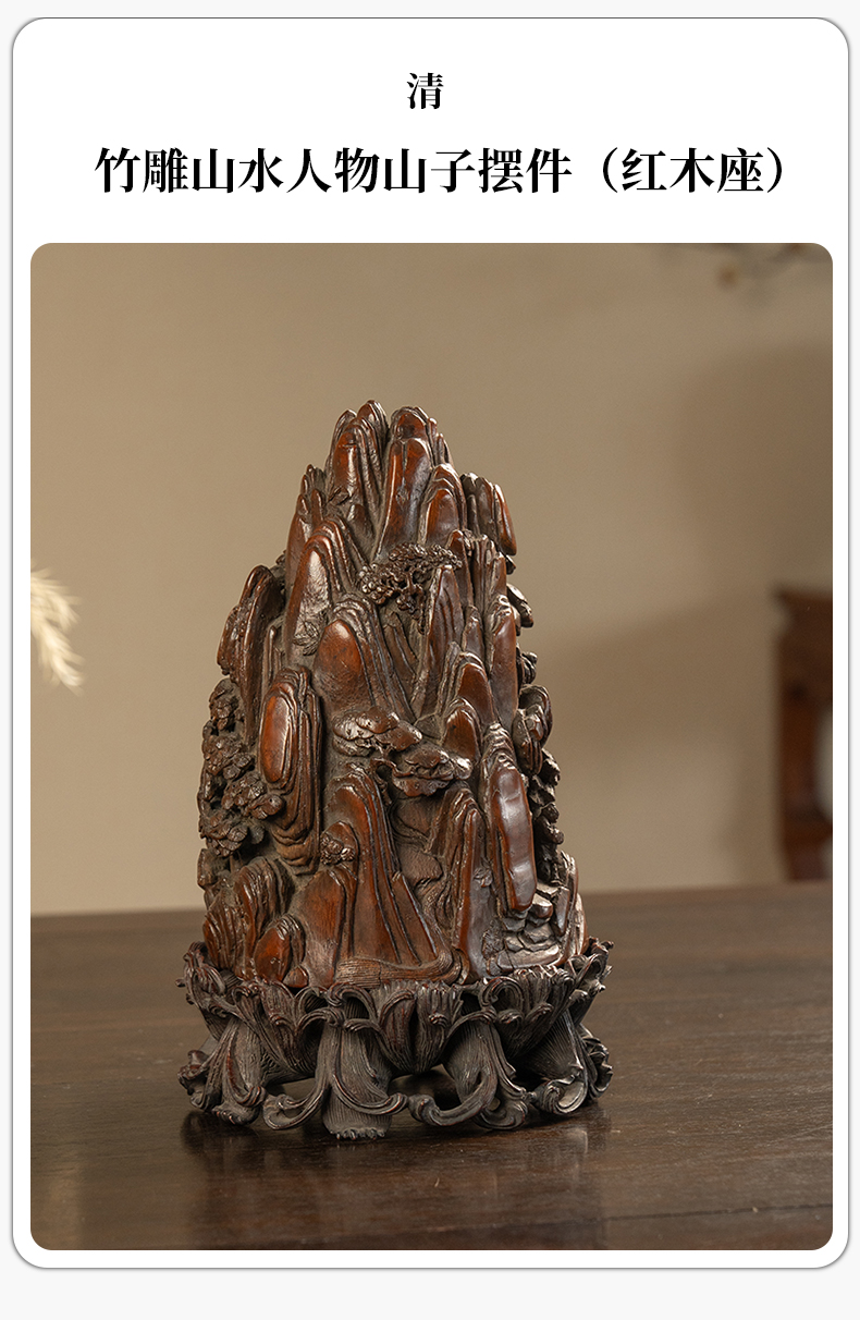 清 竹雕山水人物山子摆件(红木座)