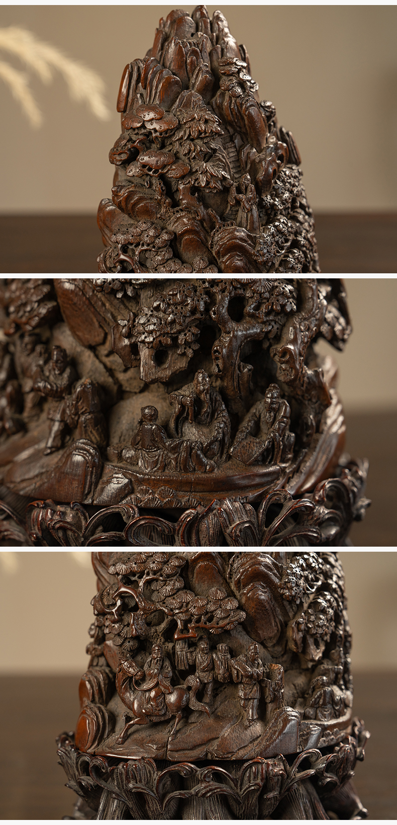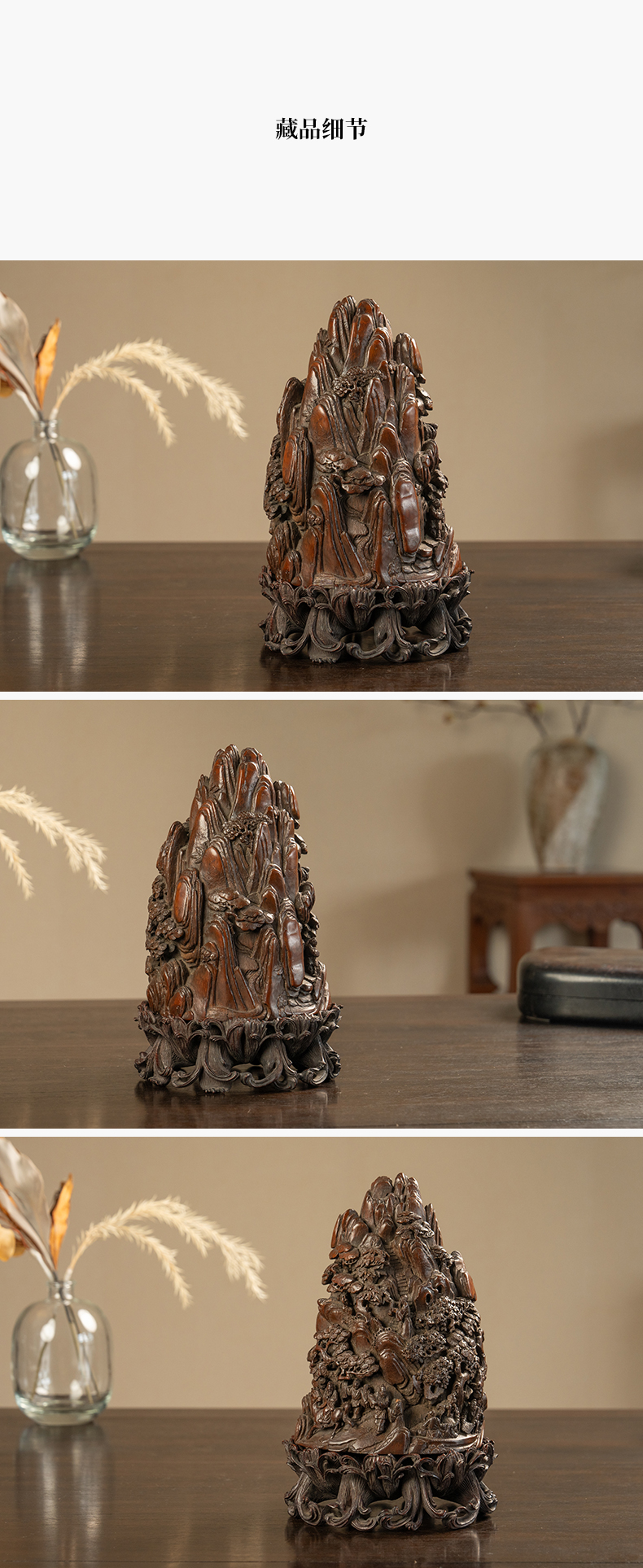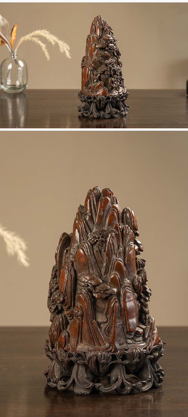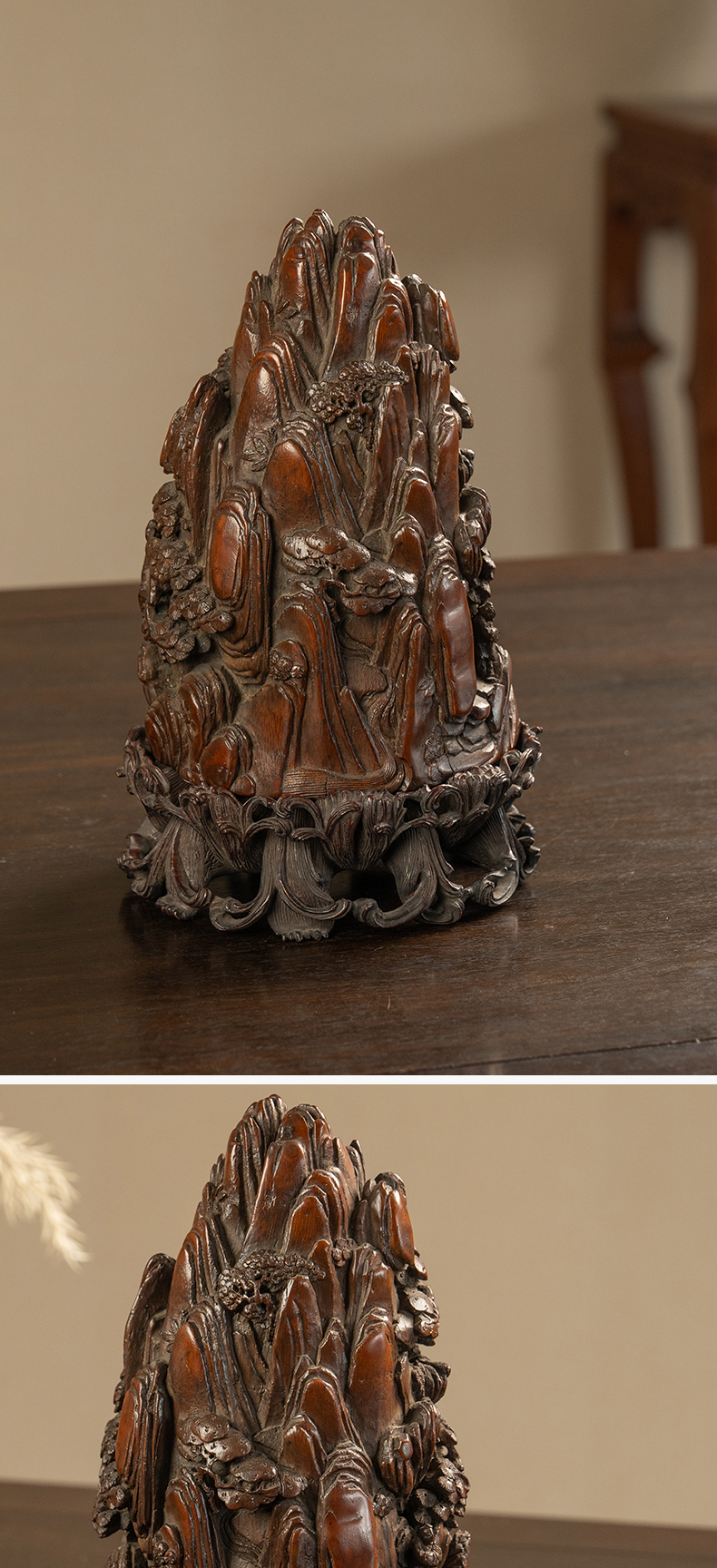 清 竹雕山水人物山子摆件(红木座)