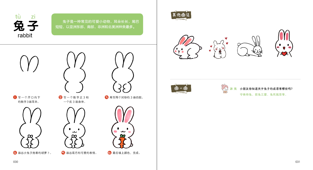 ● 每个简笔画标题包含的内容有名称、拼音、英语、百科、谜语、游戏互动、小故事、延伸知识、详细步骤画法等。