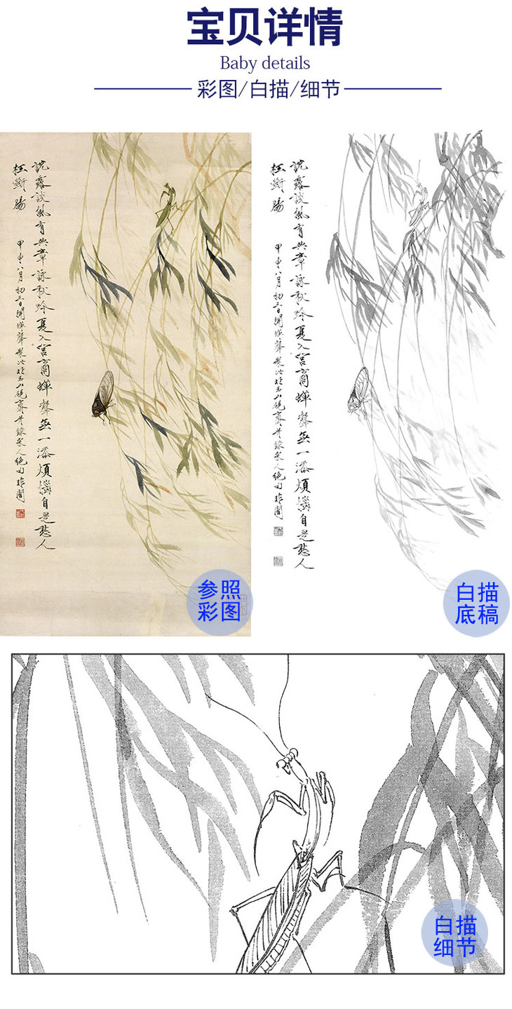 于非闇竖幅工笔花鸟白描底稿-知了《柳蝉》-多种白描尺寸可选-YF51