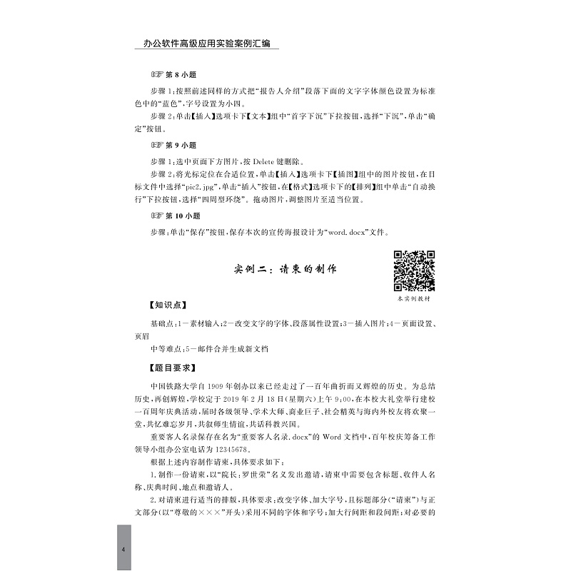 本书在内容上采用实验操作案例为主线,兼顾了2级等级考试的需求,以知识模块为框架,以实例操作为基础的方式,围绕高等院校培养“应用型人才”的教学宗旨进行组织。案例具有详细的操作步骤,配以完整的实验案例素材及操作结果。使学生掌握办公自动化的高级应用,能综合运用办公自动化软件对实际问题进行分析和解决,培养学生应用办公自动化软件处理办公事务、进行信息采集处理的实际操作能力,以便日后能更好地胜任专业工作。适合所有专业本、专科大一的学生,和参加二级等级考试的学生。