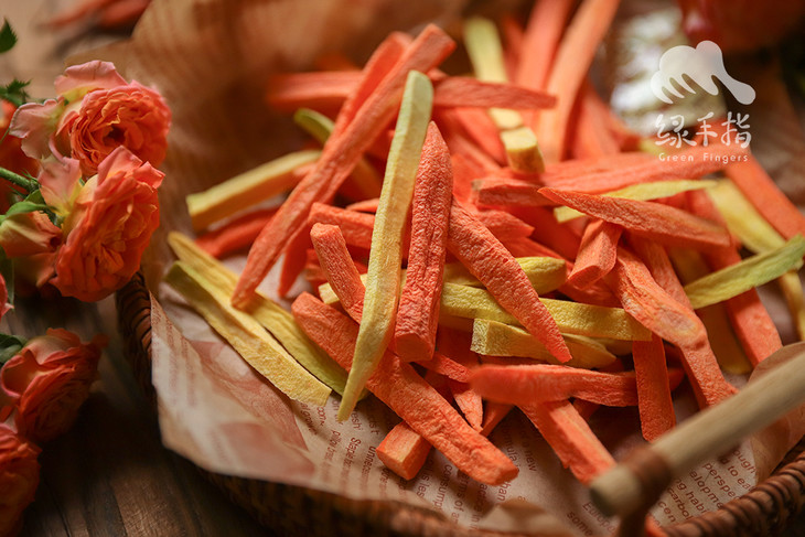 胡萝卜脆由橙色和黄色两种颜色胡萝卜制成,橙色胡萝卜脆味道浓郁,黄色胡萝卜脆清甜,口感松软香脆。采用低温冻干技术,更好的锁住胡萝卜营养和口感。