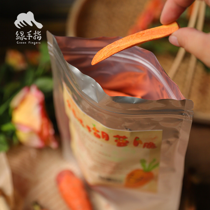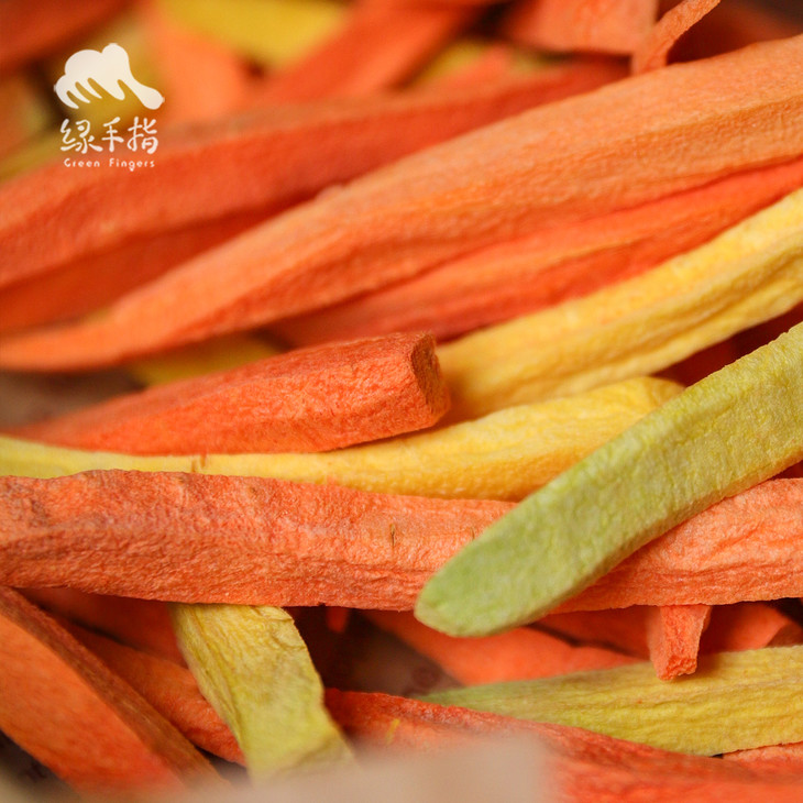 农场自有加工厂加工。加工厂就位于农场内,从地里采收后,运到加工厂,全程不超过1公里。送到加工厂后,马上开始清洗、削皮、切条后至低温冻干,更好的锁住胡萝卜的味道和营养,1袋胡萝卜干需要400g新鲜胡萝卜。加工过程中不添加香精、色素、防腐剂等,只有有机胡萝卜。