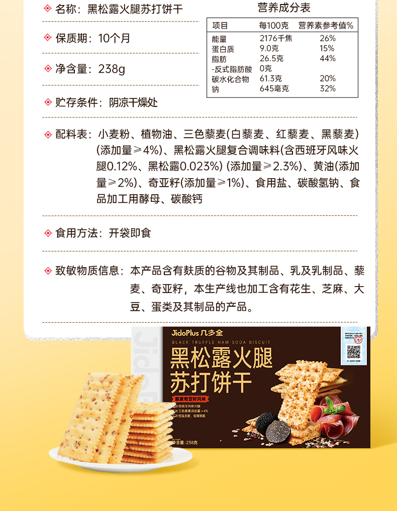 【鲜食】几多全 黑松露火腿苏打饼干 238g 添加黑松露+云南火腿 双重鲜香