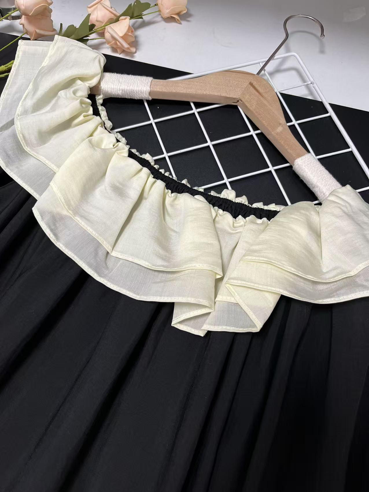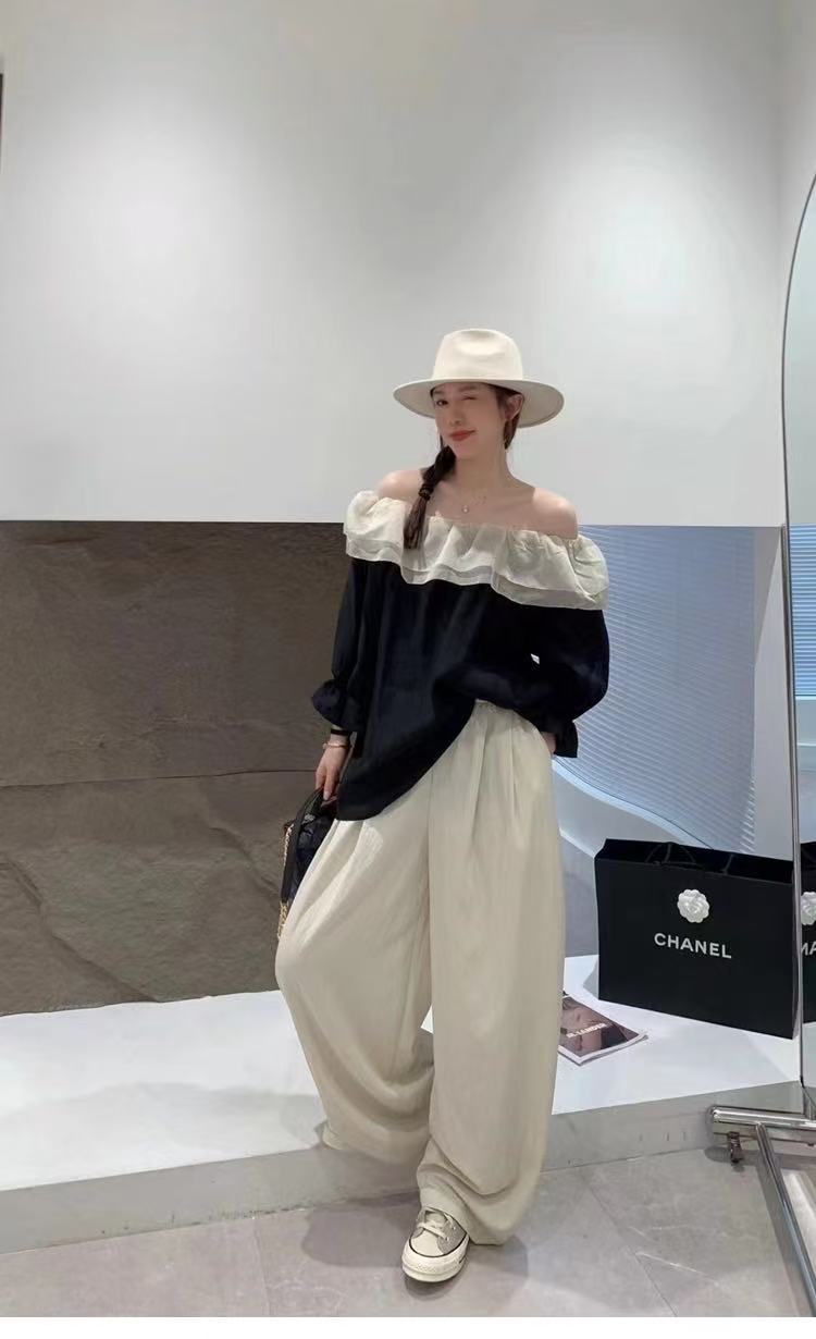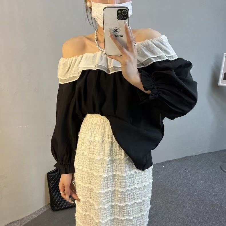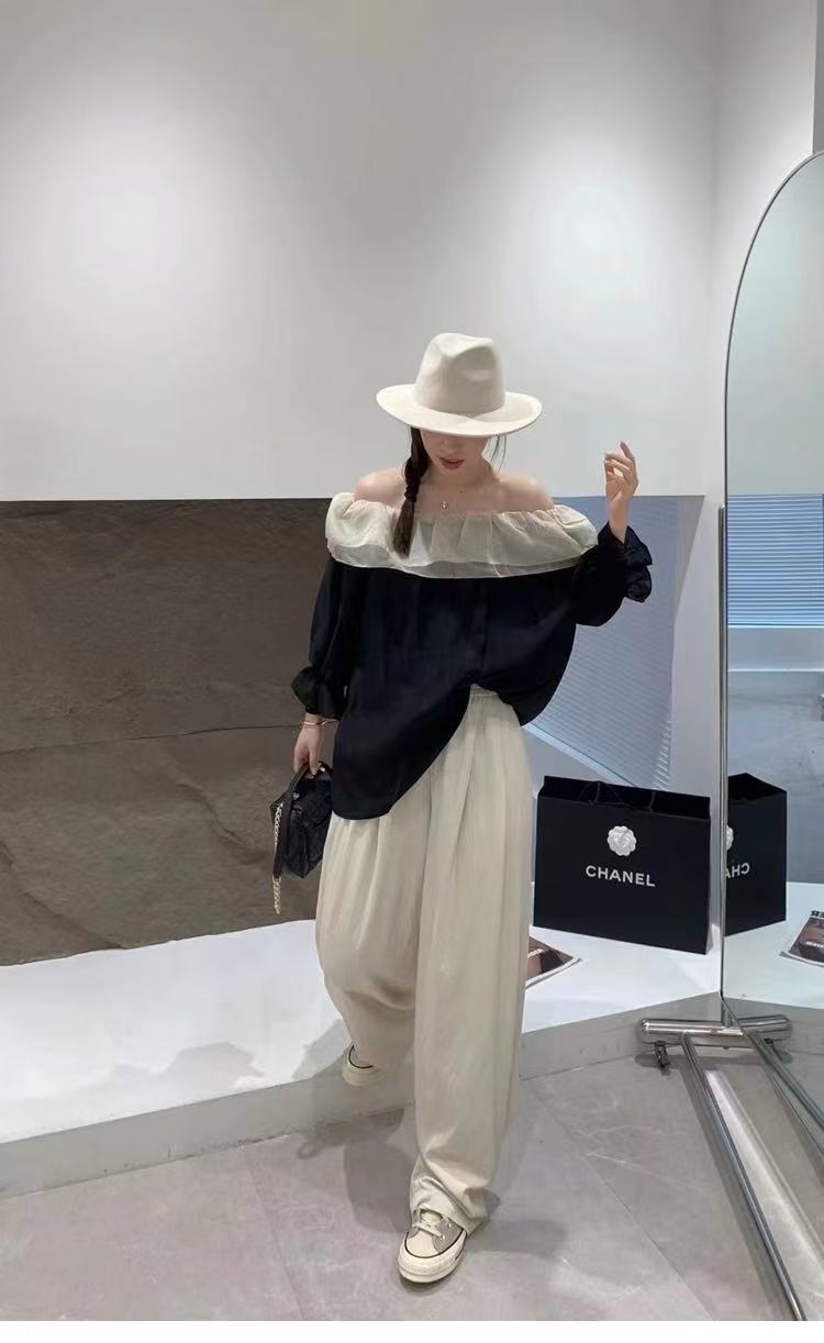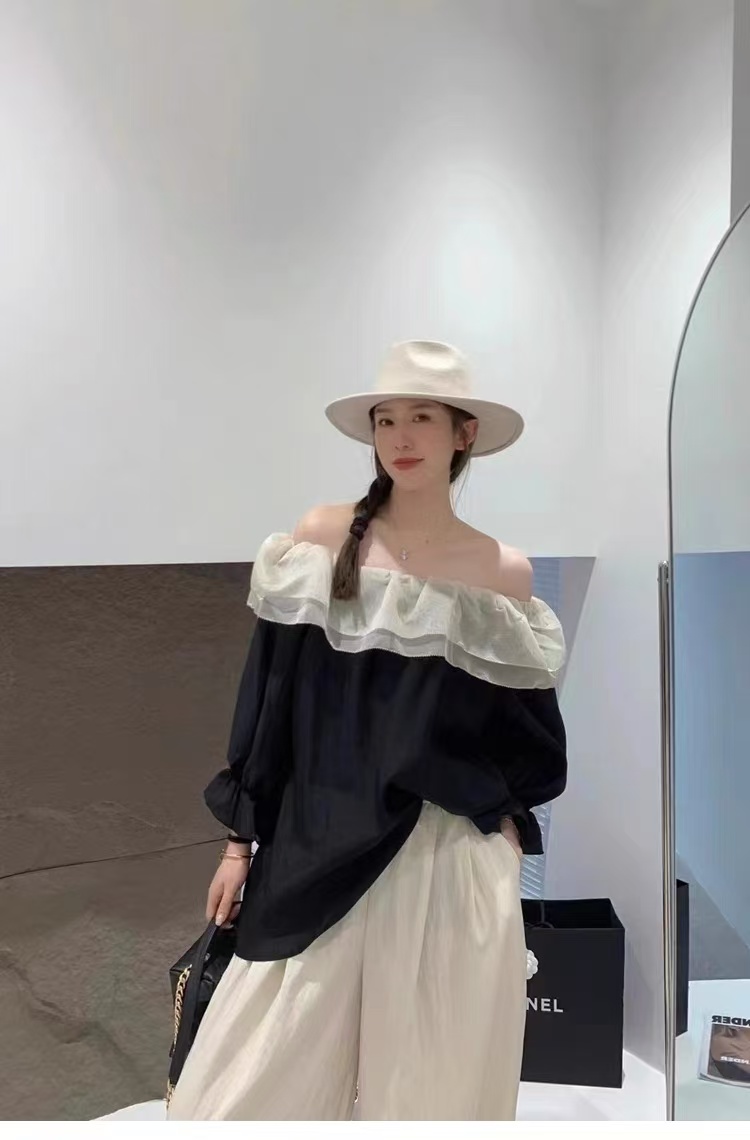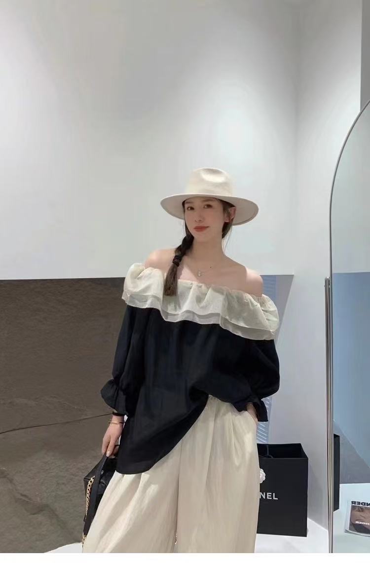 冰点价!仅限11.11!退货勿拍 原创设计师品牌- CHUMO初沫8008一字肩宽松黑拼米色花边领小衫-喜出