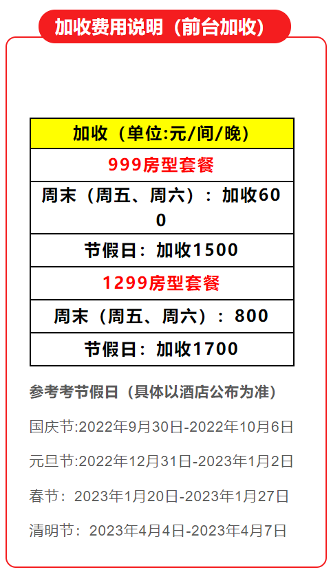 购买说明 | · 使用方式:网址预约,当天不可预约当天 · 营业时间:24小时 · 防疫政策:48小时核酸检测报告,中高风险地区旅居史7天连续阴性核酸检测报告 · 配套服务时间(仅供参考,实际以酒店为准): 入住时间:请您于当日14点之后办理入住 退房时间:请您于次日12点之前办理退房 早餐时间是:8:00-10:00 朝阳湖游玩时间是9:30-17:30 观光车时间是10:00-18:00 云顶水乡开放时间是10:00-18:00(乐园) 健身房、儿童游乐区(需家长陪同):全天可用 · 酒店可加床(300元/张),可带宠物 · 加收细则:前台加收 999 房型套餐 : 周末(周五周六)加价600元/间/晚 节假日加价1500元/间/晚 1299 房型套餐: 周末(周五周六)加价800元/间/晚 节假日加价1700元/间/晚 节假日日期参考: 国庆节:2022. 9. 30-2022. 10. 6 元旦节:2022. 12. 31-2023. 1. 2 春节:2023.1.20-2023.1.27 清明节:2023.4.4-2023.4.7 ·入住时间:14:00后、退房时间:12:00前 |